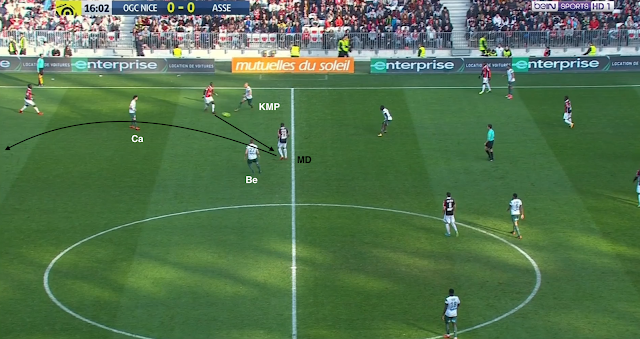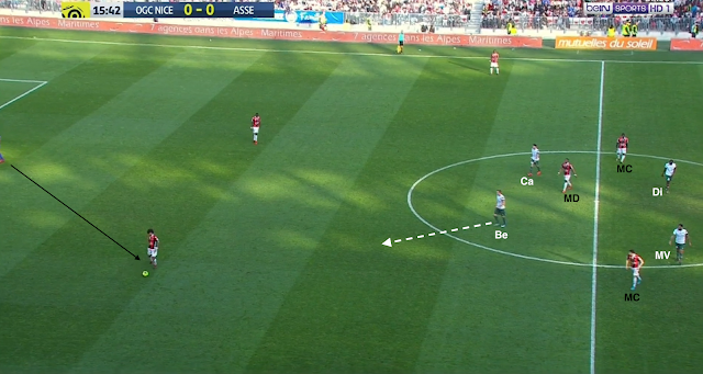 Les défenseurs niçois combinent et cherchent le milieu défensif. La ligne de 4 milieux stéphanois est en place, Beric et Cabella n'en font pas partie, ils pressent le milieu qui envoie en catastrophe vers son gardien. La relance se fait avec un défenseur central...
