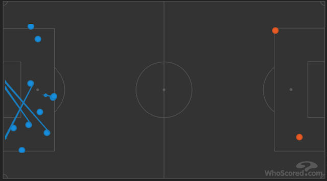 Cette capture des ballons touchés, faite sur le site whoscored.com, montre très bien quelle équipe a été présente dans la surface adverse lors de la première période :