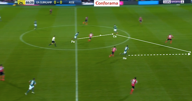 Le bloc stéphanois reste bien organisé et, sans solutions, l'avant-centre revient vers son propre camp, pendant que le latéral et l'ailier de ce côté font des appels dans l'autre sens...
