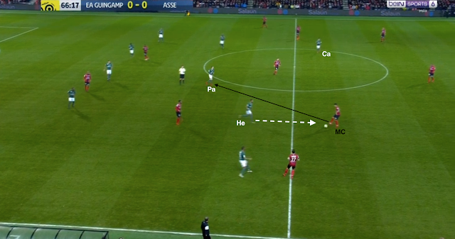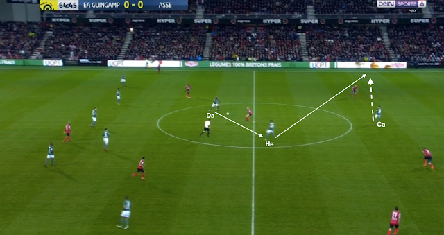 A la 15e, après une faute de Söderlund sur le même milieu central qu'il a essayé de casser quelques minutes plus tard, Guingamp bénéficie d'un coup franc dans sa propre moitié, joué dans le couloir gauche :
