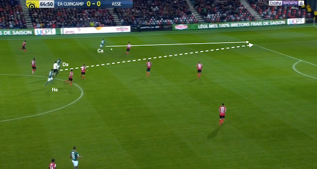 Sur cette image on peut observer que Diony défend dans le couloir droit, mais Cabella ne se trouve pas à gauche, il marque un milieu central - l'ASSE défend dans un 4-4-1-1. Le latéral gauche adverse lance son avant-centre en profondeur, mais il est bien suivi par la défense, largement en surnombre.