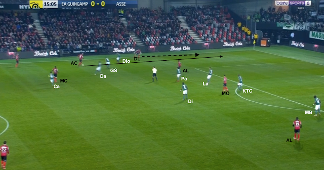 ... et ils ne sont suivis par personne ! Cabella se trouve toujours à côté de son adversaire direct, MBengue surveille l'ailier de son côté, KTC et Lacroix gardent entre eux le milieu offensif qui avait pris la place d'attaquant... et Diony, Gabriel Silva et Dabo s'intéressent seulement au porteur du ballon, et non aux deux adversaires dans leur dos.