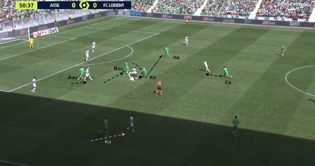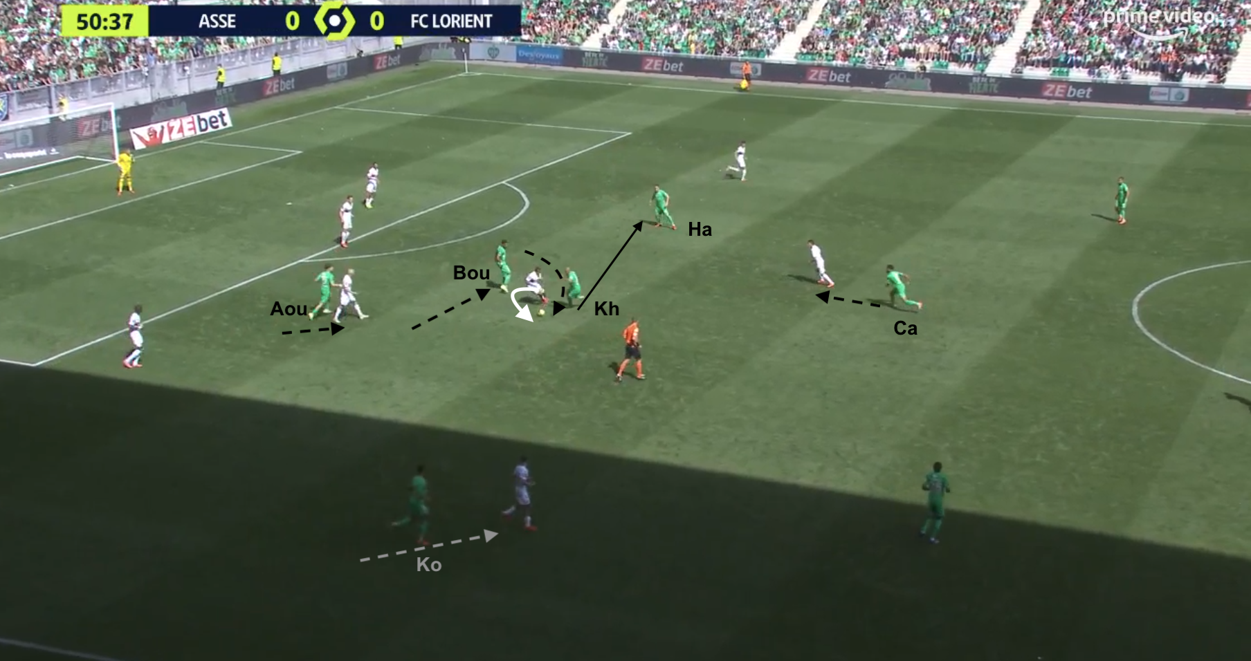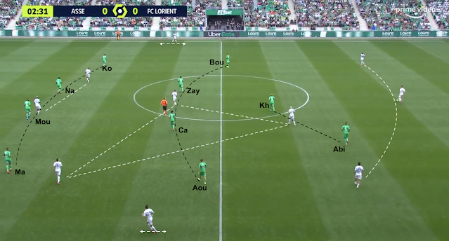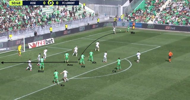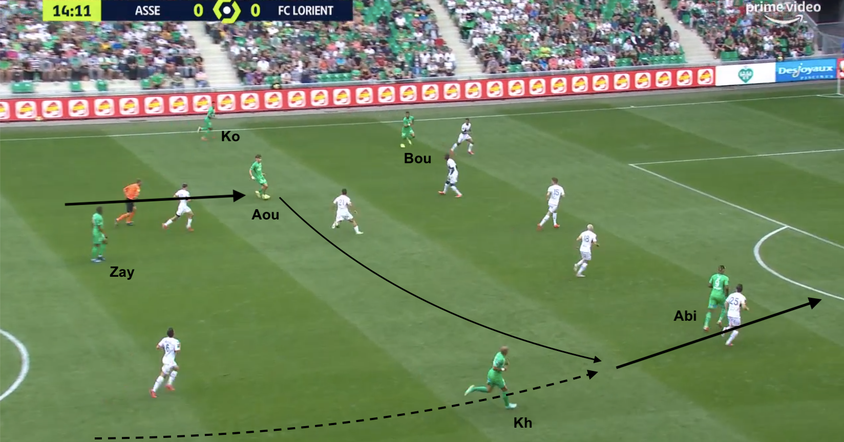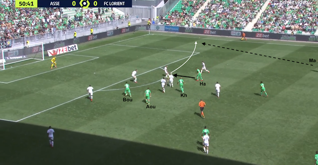 Cet espace est pris par la remontée de Kolo, qui combine avec Youssouf et Aouchiche, ce dernier étant lancé balle au pied vers la défense. C'est toujours difficile de défendre en reculant, mais la défense de Lorient est aidé par les faibles appels stéphanois : seulement Abi et Bouanga s'y trouvent, et ils sont complètement excentrés, leurs courses ne créant pas des décalages.