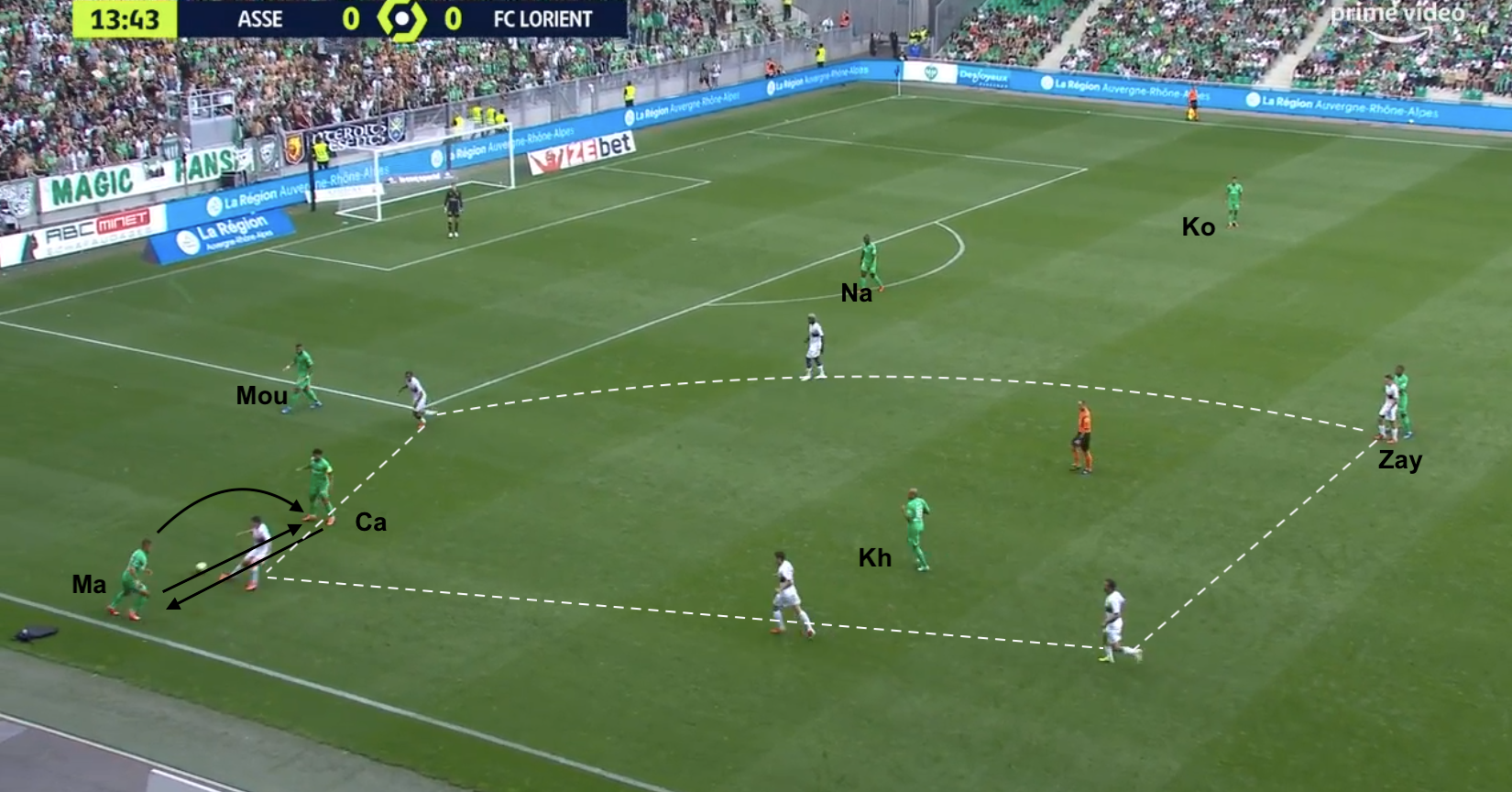 Dans cet exemple, Maçon joue une touche avec Camara, qui lui redonne le ballon avant de le recevoir à nouveau. Six joueurs de Lorient se trouvent dans ce quart de terrain, bien décidés à enfermer les Verts et les pousser à la faute. Malgré le pressing de deux d'entre eux...
