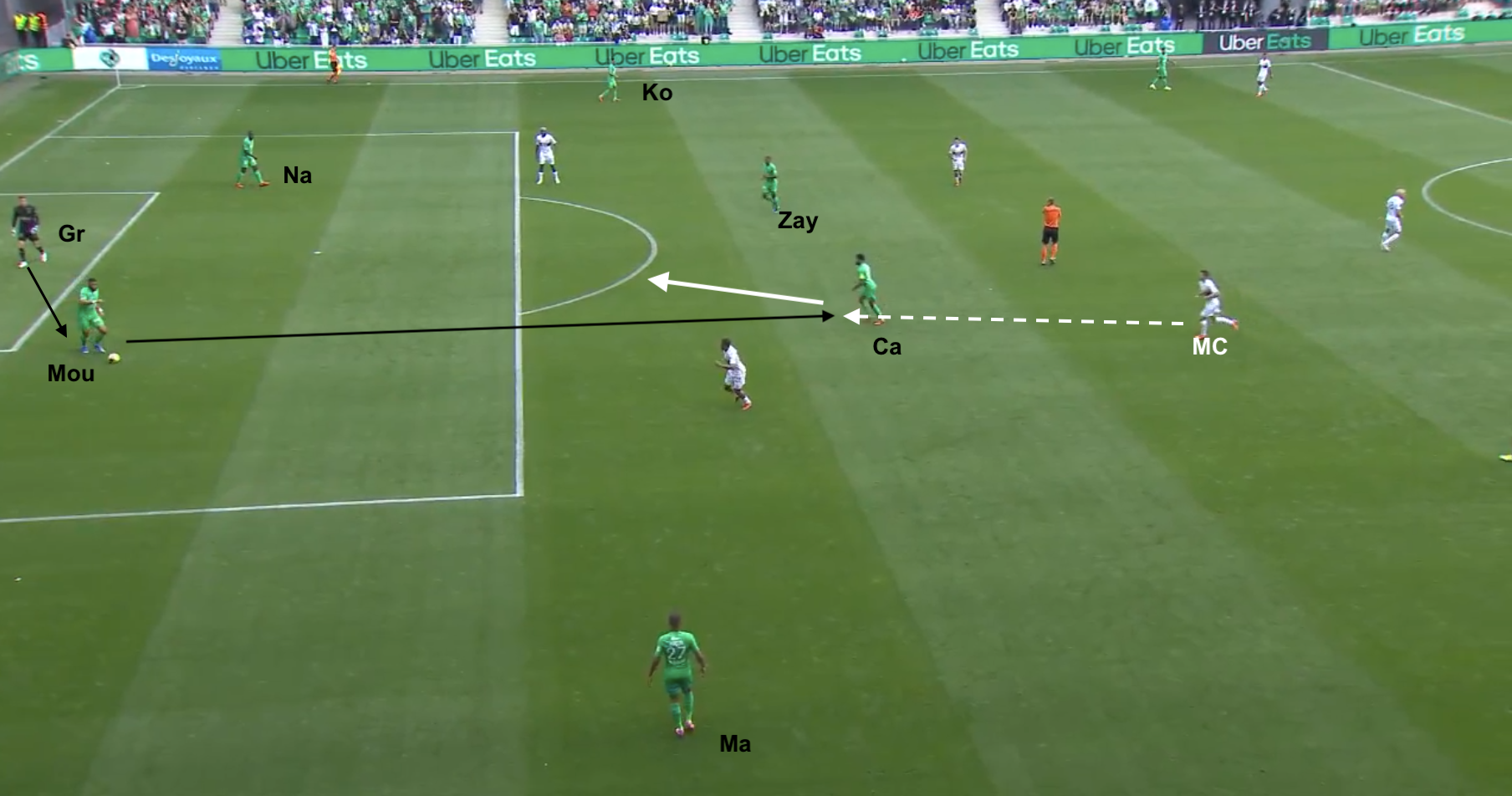 Même si les Verts ont recherché à remonter le ballon proprement de leur propre moitié, ils ont préféré avoir la possession dans la moitié adverse. Moins d'espaces, plus de pertes de balle, mais aussi plus d'opportunités qui en découlent, grâce au contre-pressing. Qui est tout simplement le pressing effectué juste après avoir perdu le ballon, pour le récupérer et profiter du fait que l'adversaire est en déséquilibre (se projetant déjà dans une phase de transition). Et les protégés de Claude Puel ne sont pas avares d'effort sur cet aspect, comme par exemple à la 19e minute :