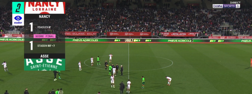 Un 3-4-3 avec deux milieux de terrain, Kanté et Boakye, et deux pistons censés dominer leurs couloirs, Appiah et Old. Ça avait très bien marché contre le bloc haut d'Annecy, avec des espaces dans le dos de la défense adverse, mais ça n'a pas du tout fonctionné contre le bloc bas en 4-4-2 de Nancy. Il n'y avait pas d'espace ni dans le dos de la défense, ni entre les lignes, et les Verts ont eu du mal à remonter le ballon. Comme par exemple à la 10e minute...