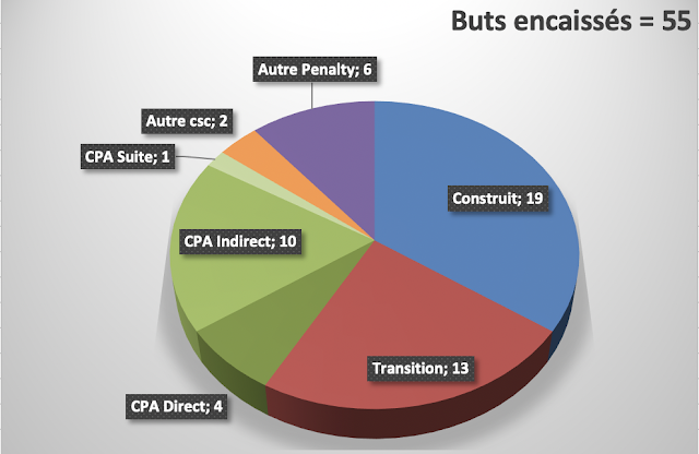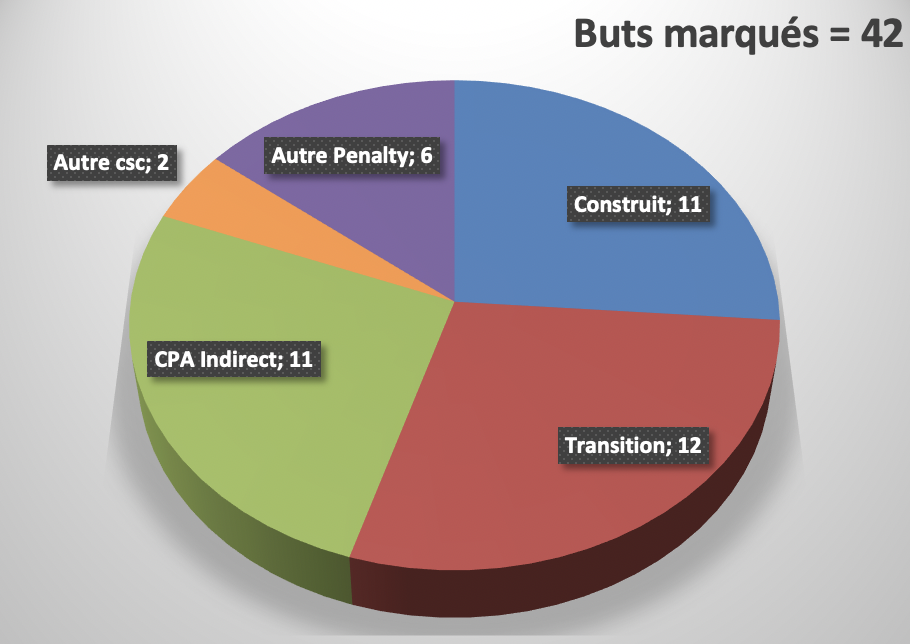 A peine plus d'un but marqué par match, une moyenne similaire à celle de la saison d'avant. Par contre, là aussi une différence importante est visible entre les deux saisons. Les Verts de Printant et Puel avaient marqué plus de buts sur attaques construites que sur phases de transition et CPA réunies, quand lors de la saison qui vient de finir la répartition entre ces 3 types est quasiment identique...