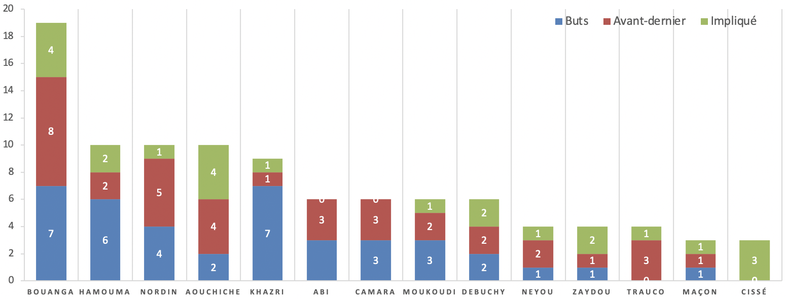 Pour être complet, sans marquer, Boudebouz a été l'avant-dernier joueur sur 2 buts cette saison, en tant que tireur de CPA pour Camara à Brest et Moukoudi contre Nîmes. Et cinq autres joueurs ont été impliqués dans un but chacun : Moulin, Kolo, Gourna-Douath, KMP et Krasso.