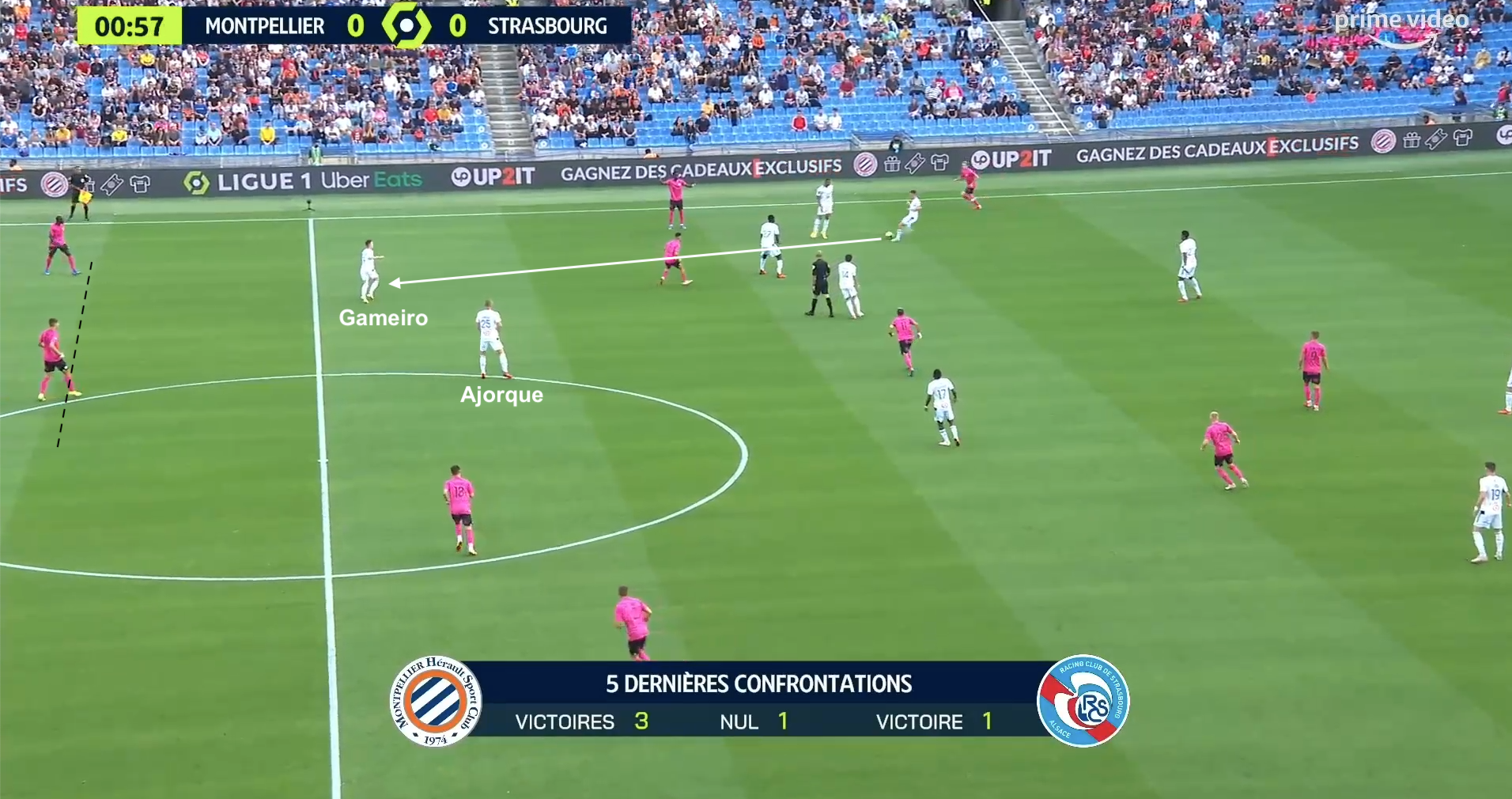 C'est le lancement de jeu habituel pour cette équipe (4 fois dans les premières 5 minutes du match) : long dégagement du gardien à destination d'Ajorque, qui gagne souvent ses duels aériens. Dans ce cas, il arrive donc à passer le ballon à son milieu de terrain, pendant que Gameiro se trouve un peu plus haut. Le jeu continue à gauche...