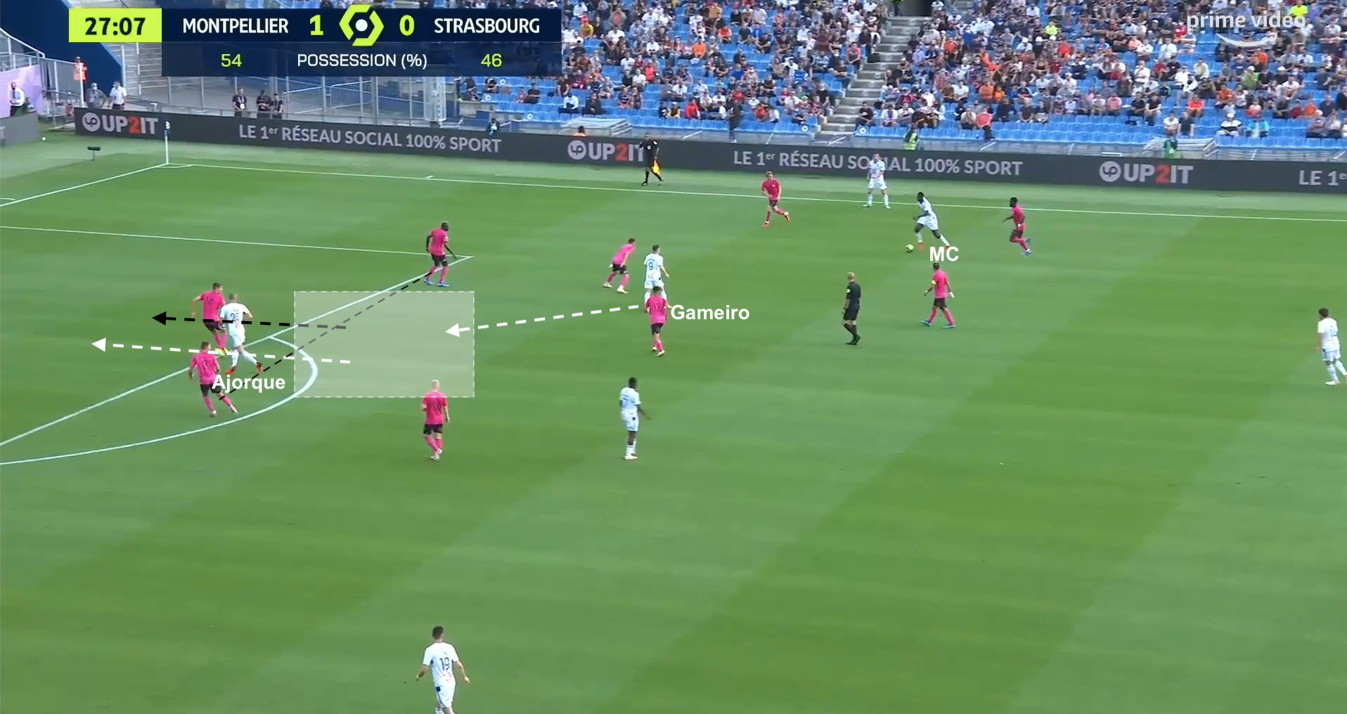 ... et Gameiro qui peut être ainsi trouvé à l'entrée de la surface, pour une combinaison avec le piston. Les déplacements d'Ajorque ont clairement l'objectif de créer de l'espace derrière, où un autre joueur y sera trouvé, et parfois ça paye. Le but de Strasbourg dans ce match est parti d'un mouvement de ce type :