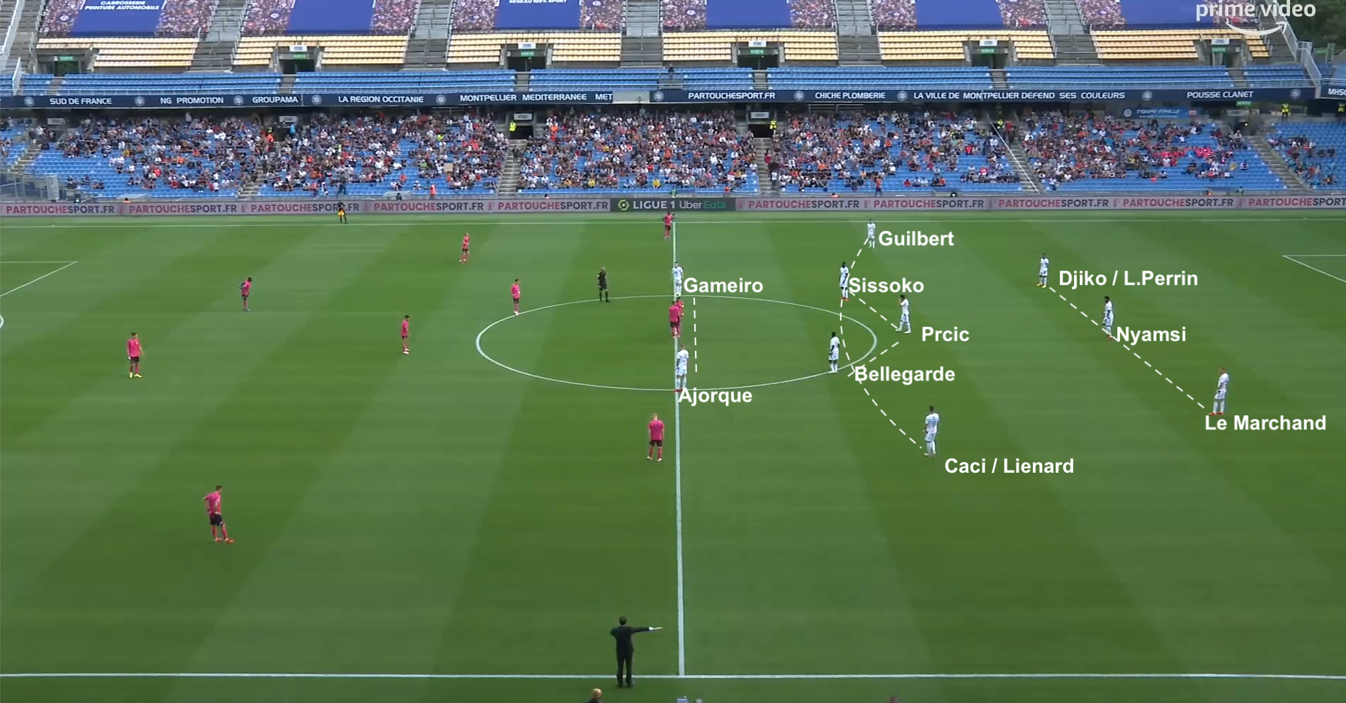 Sur cette image on aperçoit Bellegarde, milieu relayeur, sortir du bloc et déclencher un pressing, car un milieu axial adverse avait le ballon. Ça a été l'élément déclenchateur de pressing à chaque fois que Montpellier avait le ballon dans sa propre moitié. Par exemple, quelques minutes plus tard :