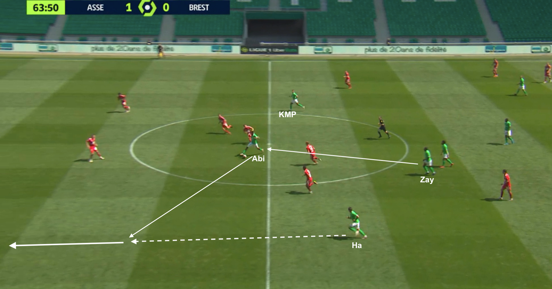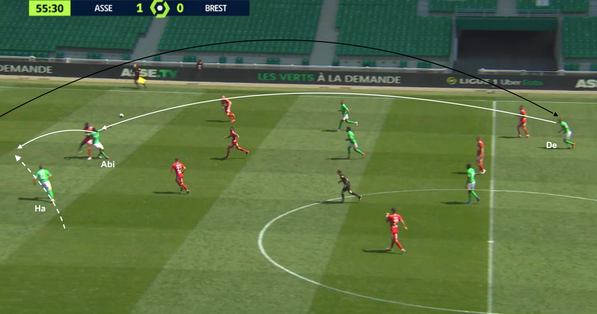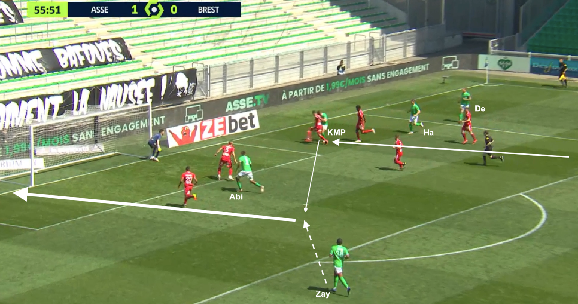 Ces changements ont démarré un temps fort pour l'ASSE, basé sur le bon jeu dos au but d'Abi, son entente avec Hamouma et surtout des projections rapides suite à des ballons récupérés. Un premier exemple commence à la 56e avec un dégagement du goal adverse...