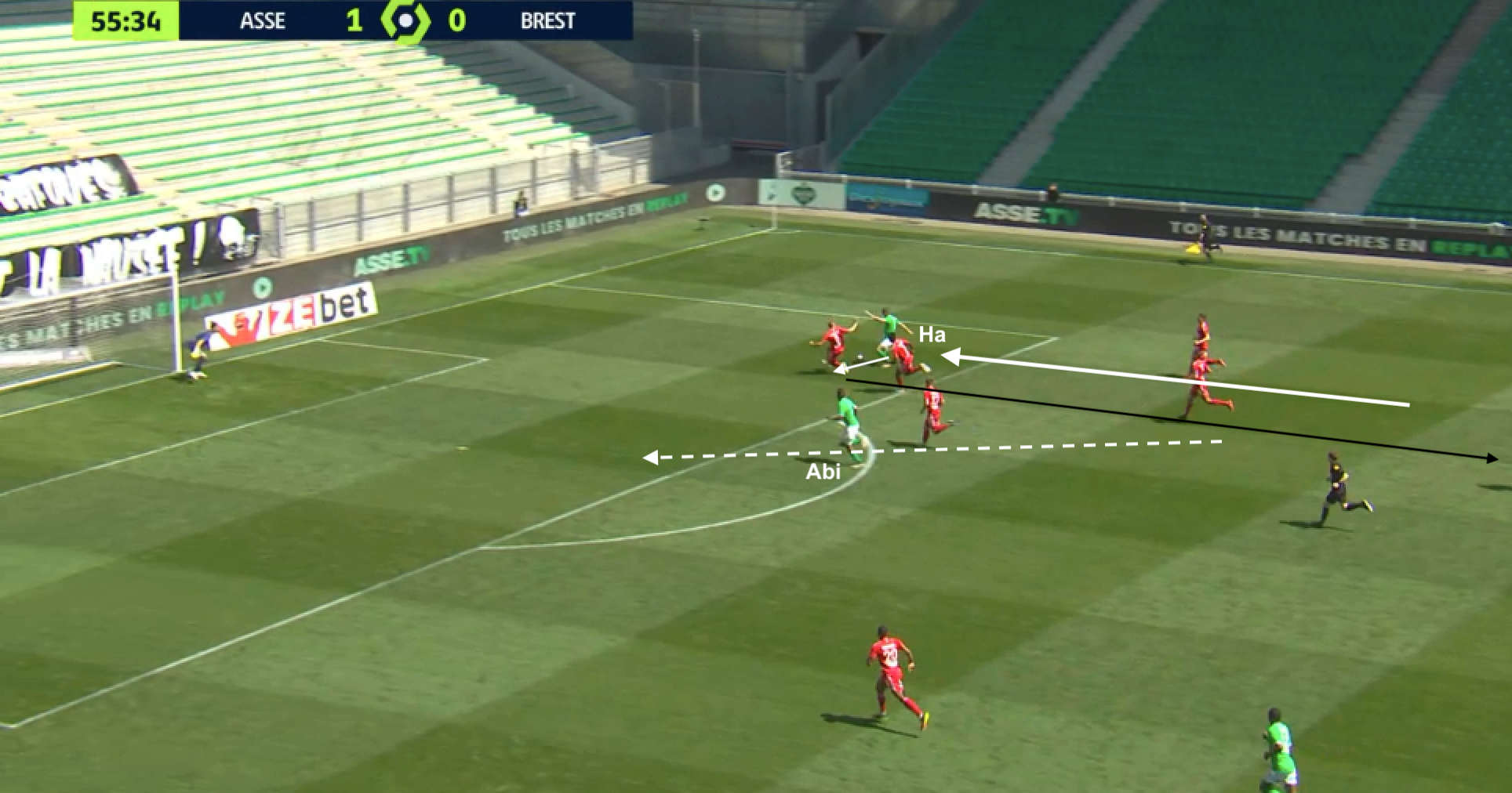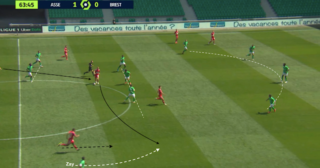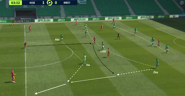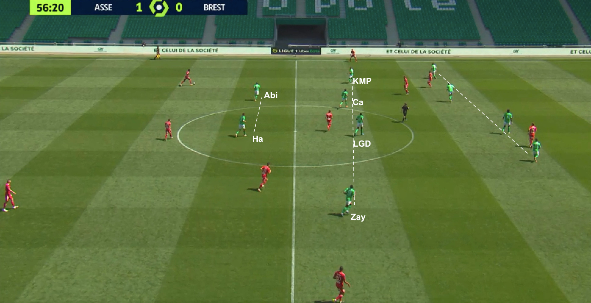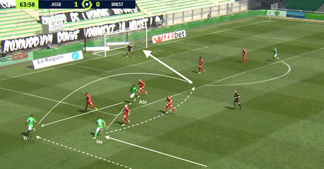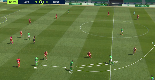 Ces changements ont démarré un temps fort pour l'ASSE, basé sur le bon jeu dos au but d'Abi, son entente avec Hamouma et surtout des projections rapides suite à des ballons récupérés. Un premier exemple commence à la 56e avec un dégagement du goal adverse...