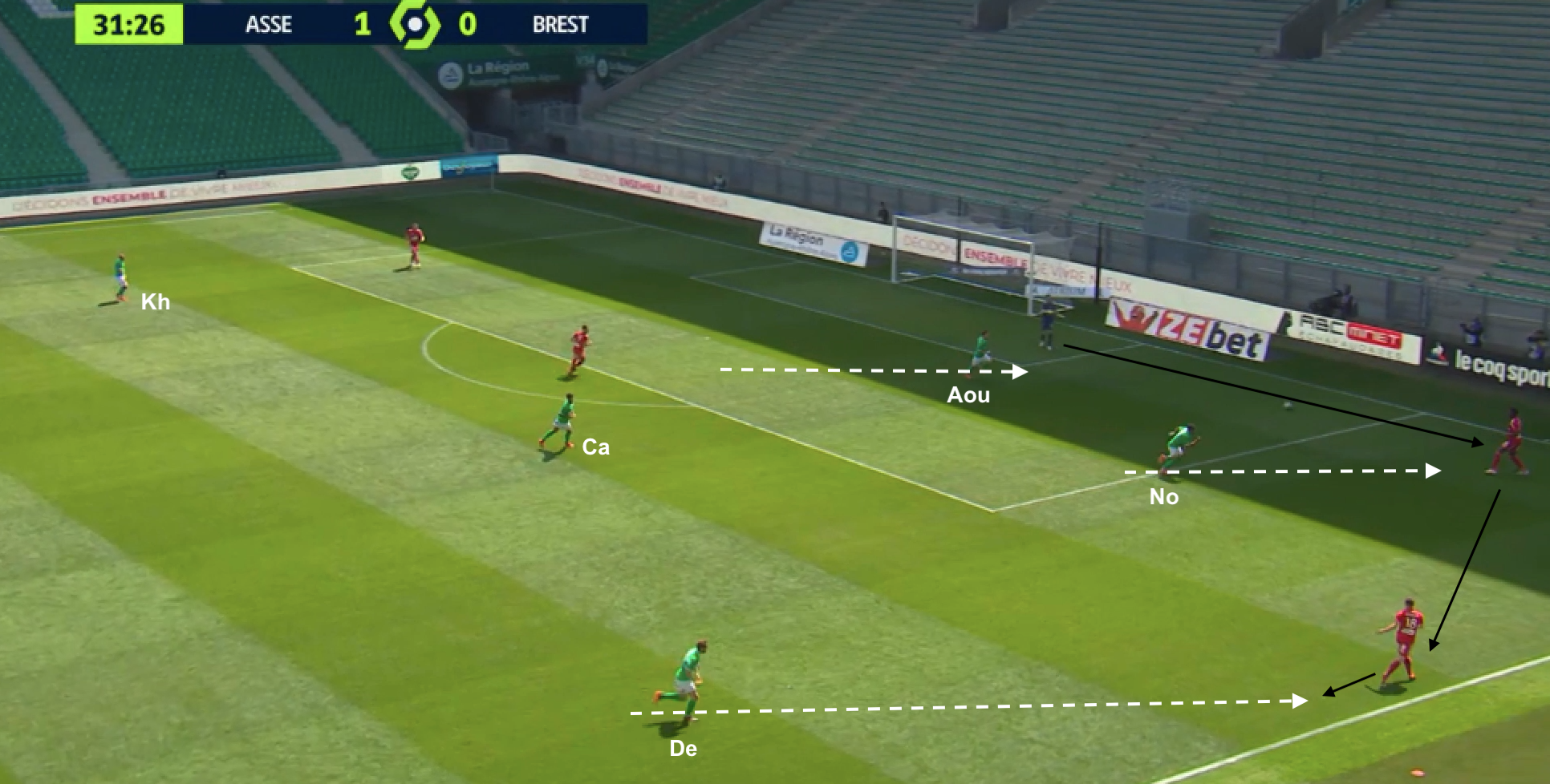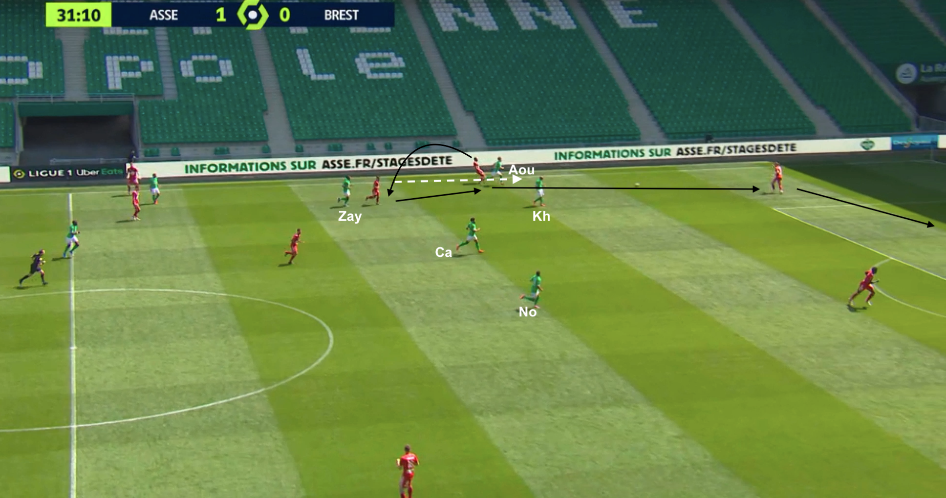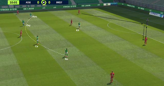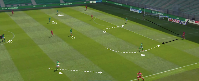 Khazri sprinte vers le gardien, Nordin vers ce défenseur central et Debuchy vers le latéral du même côté. Vu que son coéquipier est pris et sans aucune possibilité de passe (Camara coupant l'angle vers l'axe), le défenseur panique, essaye de monter balle au pied et Nordin intercepte. Le ballon arrive à Khazri et les Verts ouvrent le score.