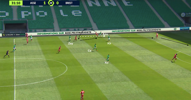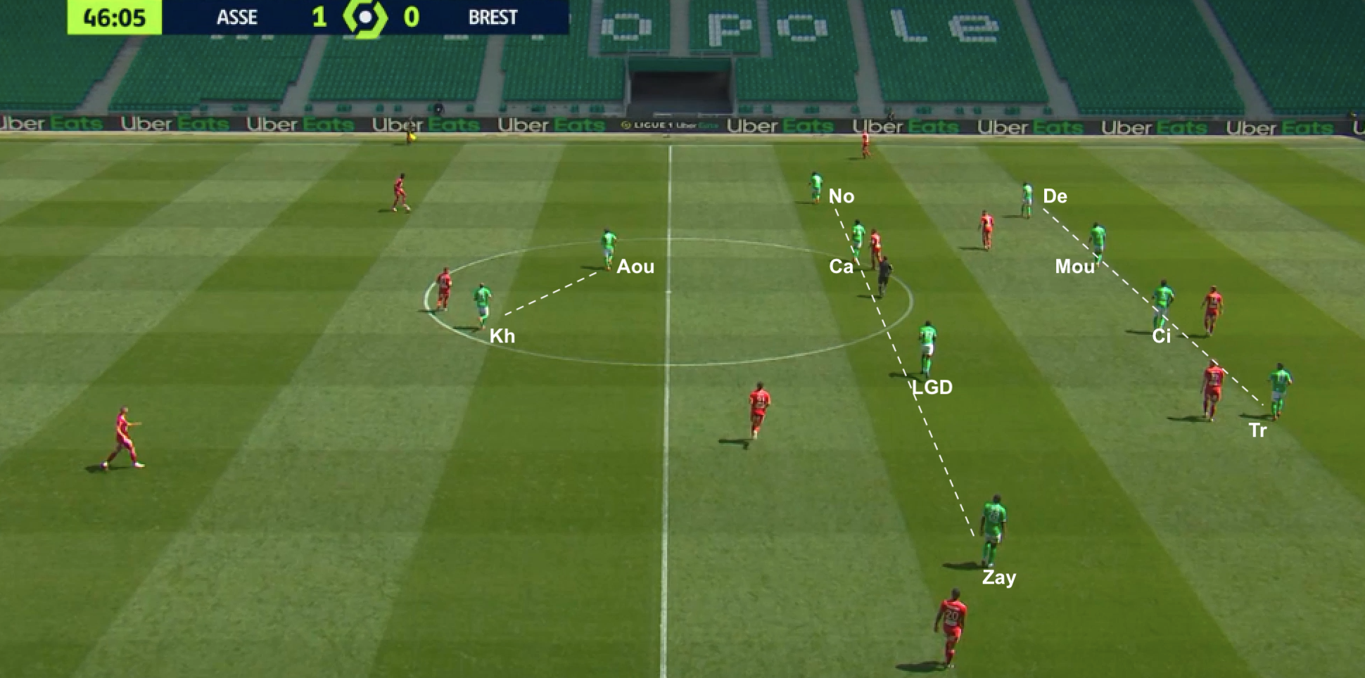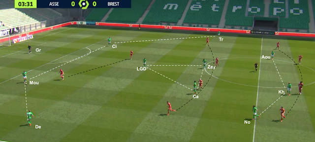 Un 4-3-3 avec le trio Aouchiche - Khazri - Nordin devant, contre un 4-4-2 classique du côté de Brest. Sans ballon, le 4-3-3 devient un 4-1-4-1 et dans le cas des Verts, la ligne de 4 milieux était bien haute en début de match :
