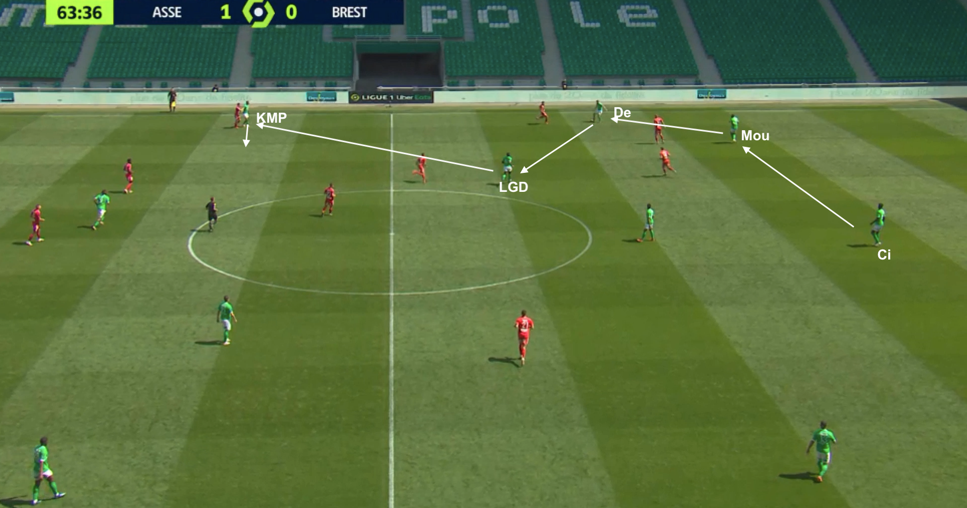 Camara, KMP et Moukoudi serrent immédiatement un avant-centre qui avait décroché pour essayer de garder le ballon et la possession est de nouveau stéphanoise. KMP lance Debuchy dans le couloir droit...