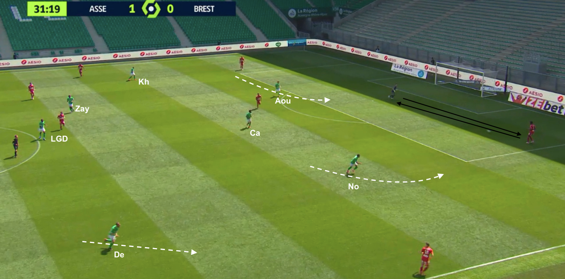 ... et donc le pressing stéphanois démarre, avec Aouchiche qui continue sa course vers le gardien, Nordin vers le défenseur et Debuchy vers le latéral, avec Camara qui couvre l'axe. Pas de possibilités de sortir, le pressing continue...