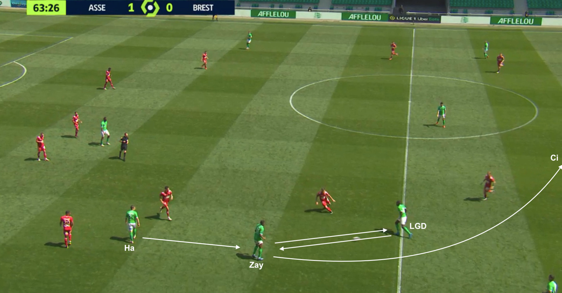 Le pressing haut a continué, avec les Stéphanois qui ont récupéré très souvent la possession dans le camp adverse. Et quand il s'agissait de déclencher un pressing, on peut observer le même déclenchement dans cet exemple à la 32e minute :