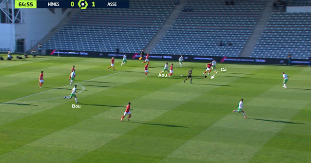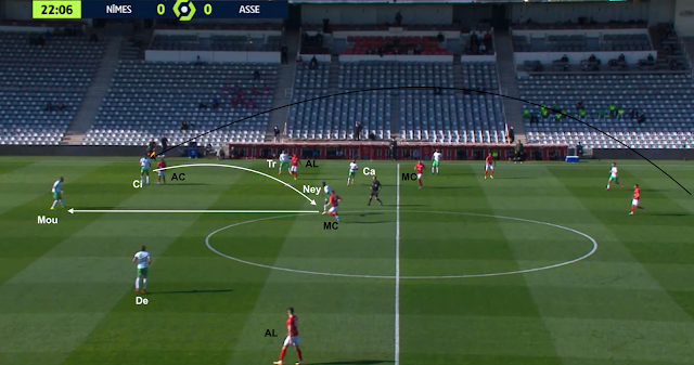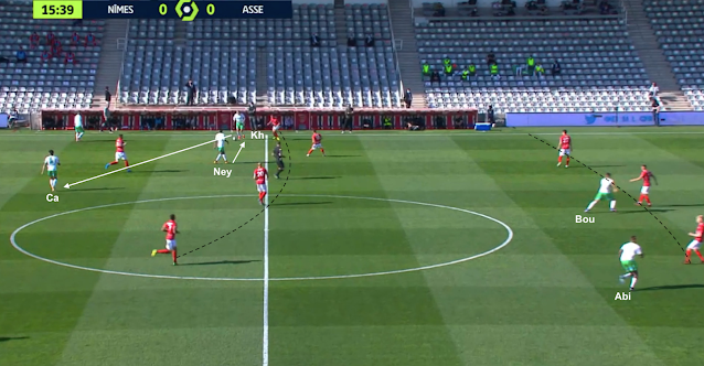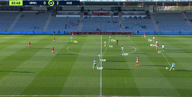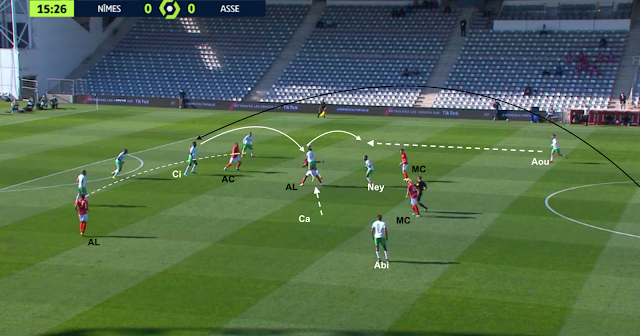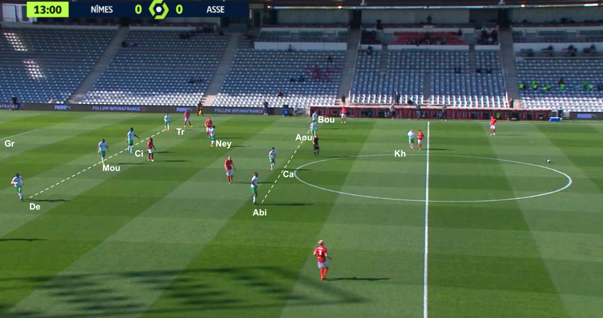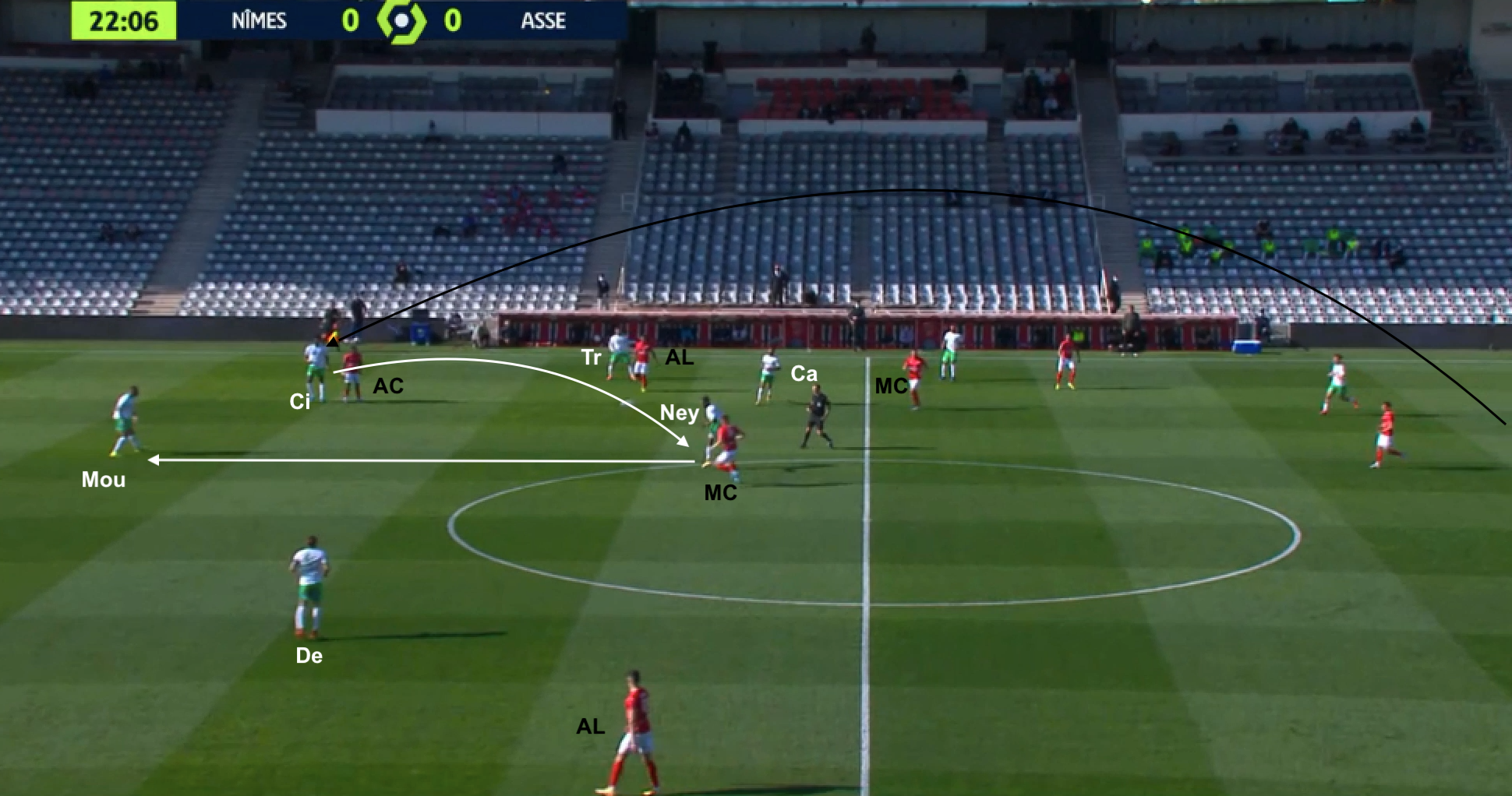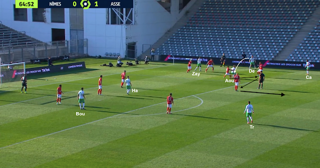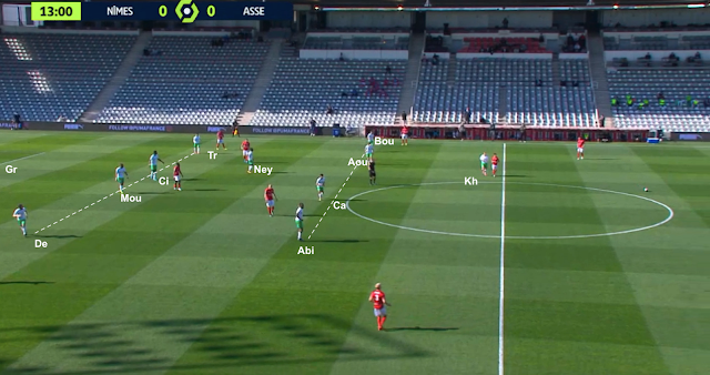 Camara, Aouchiche et les deux défenseurs centraux se passent le ballon, les trois offensifs sont dans la défense adverse, avec Abi qui décroche avant d'y retourner. Un milieu nîmois sort pour presser Aouchiche et les deux ailiers resserrent pour couvrir Neyou et Abi. Ce qui laisse les couloirs pour les latéraux stéphanois, dont notamment Trauco à gauche qui commence à sprinter dès que le ballon arrive dans les pieds de Cissé. Qui le trouve parfaitement...