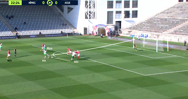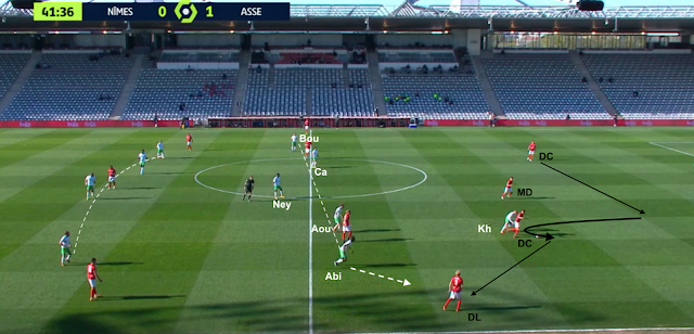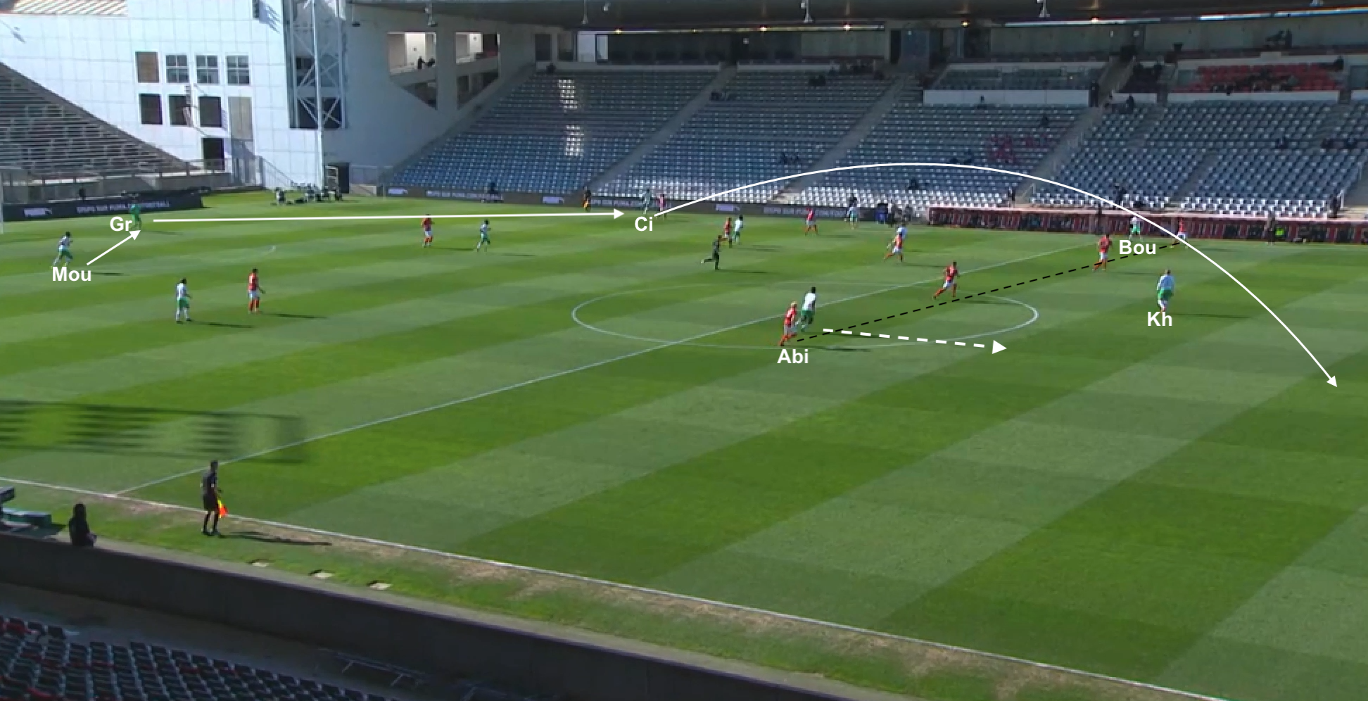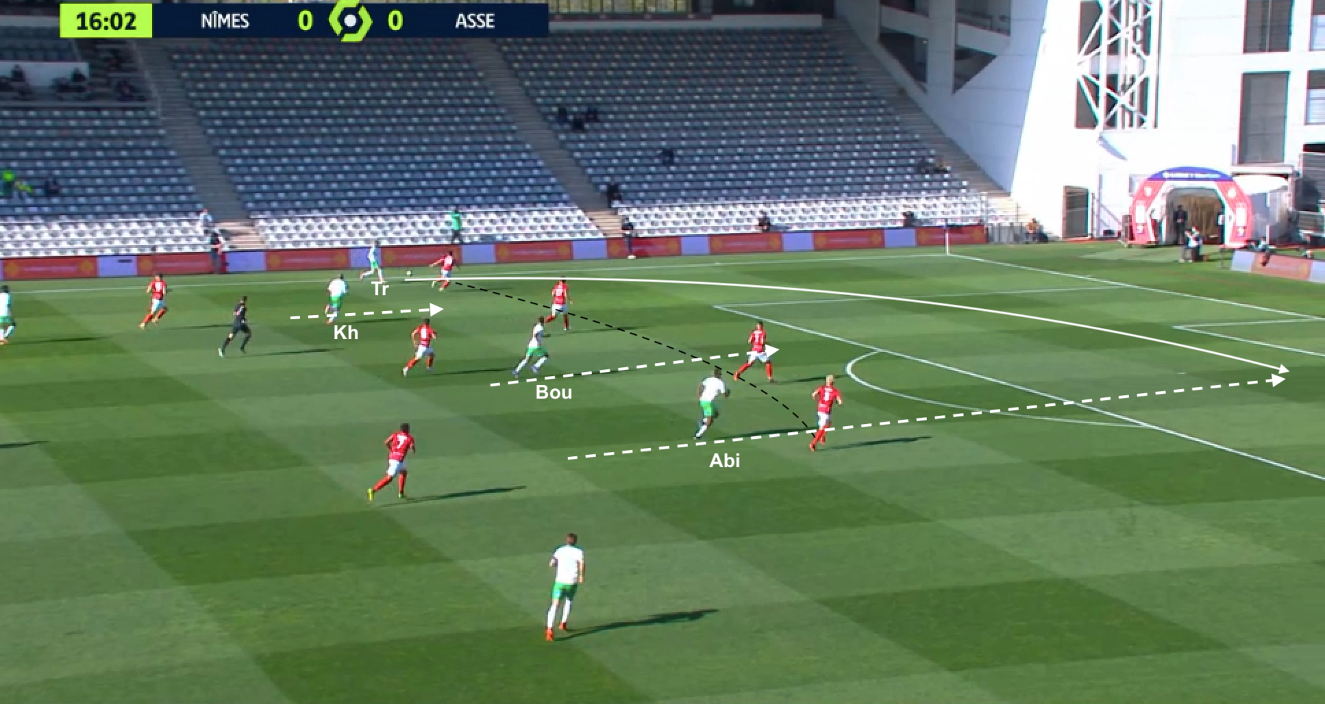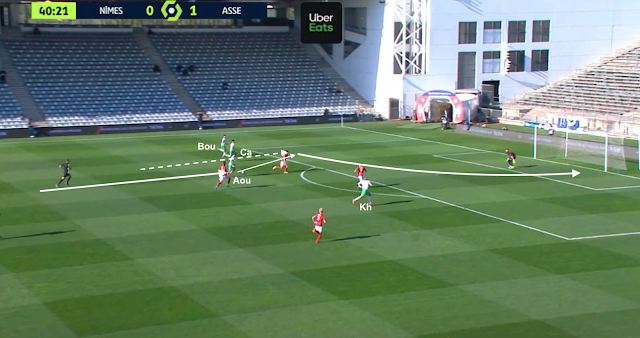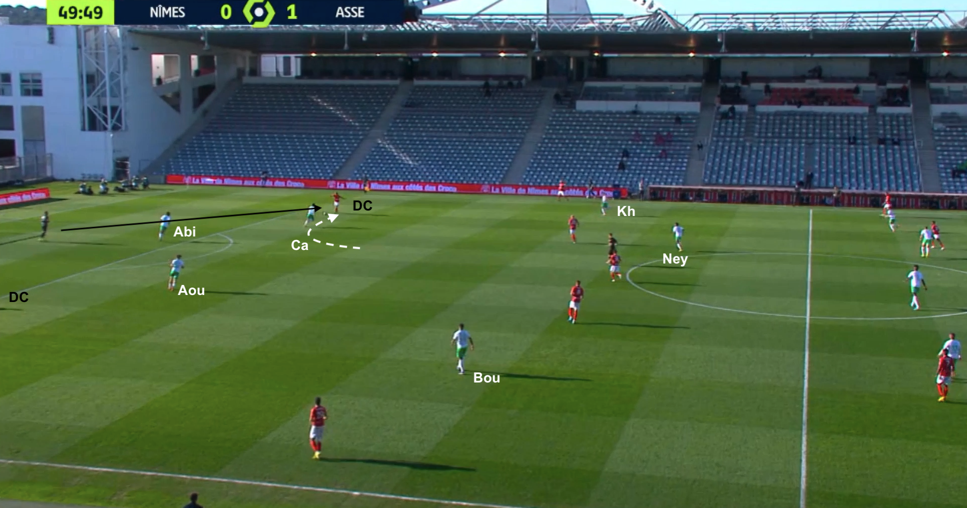 Camara, Aouchiche et les deux défenseurs centraux se passent le ballon, les trois offensifs sont dans la défense adverse, avec Abi qui décroche avant d'y retourner. Un milieu nîmois sort pour presser Aouchiche et les deux ailiers resserrent pour couvrir Neyou et Abi. Ce qui laisse les couloirs pour les latéraux stéphanois, dont notamment Trauco à gauche qui commence à sprinter dès que le ballon arrive dans les pieds de Cissé. Qui le trouve parfaitement...