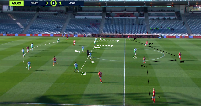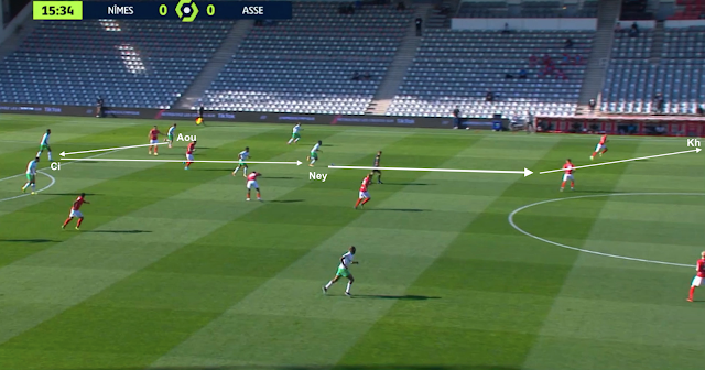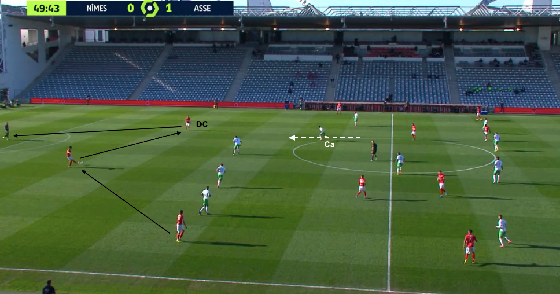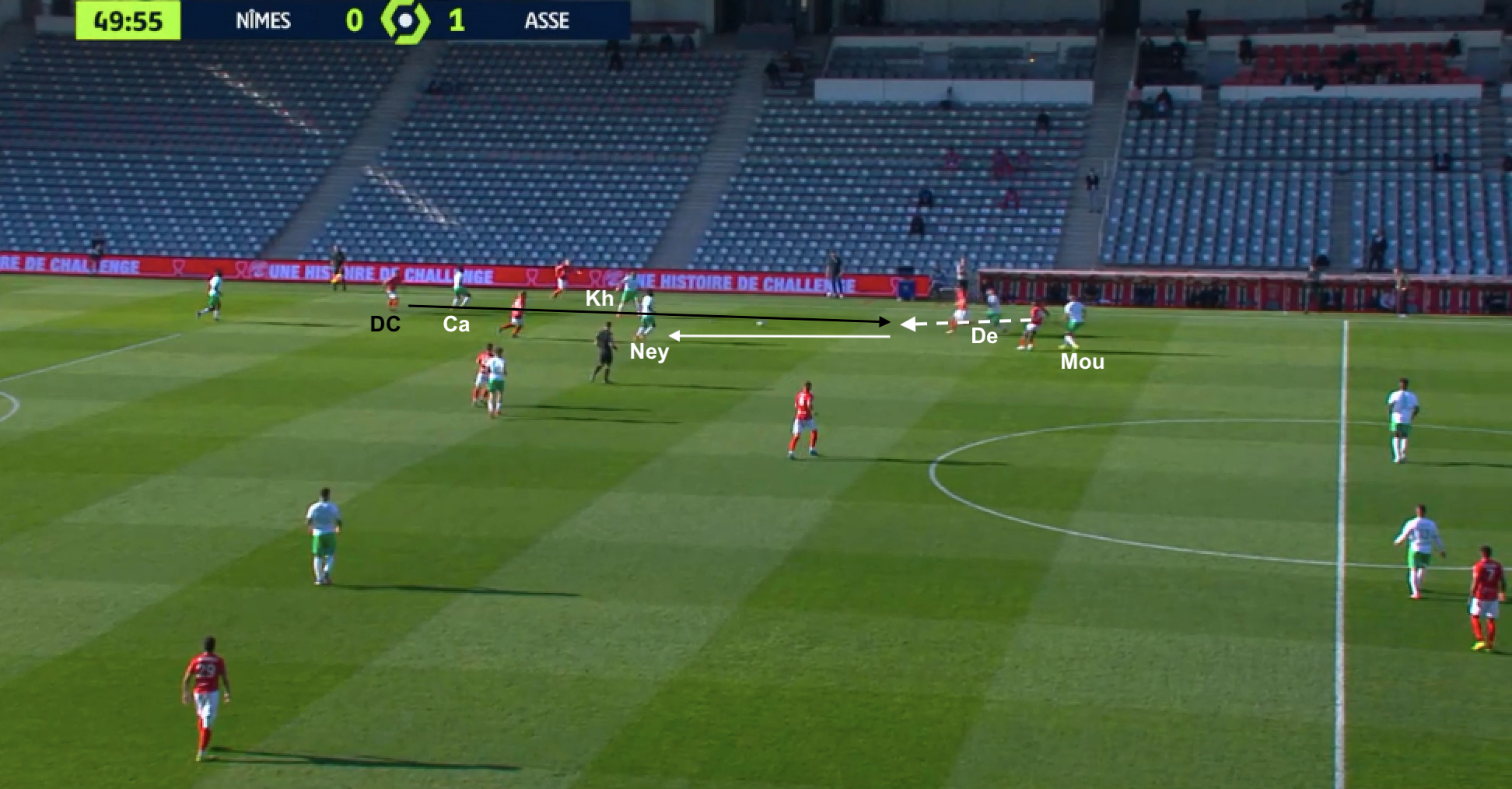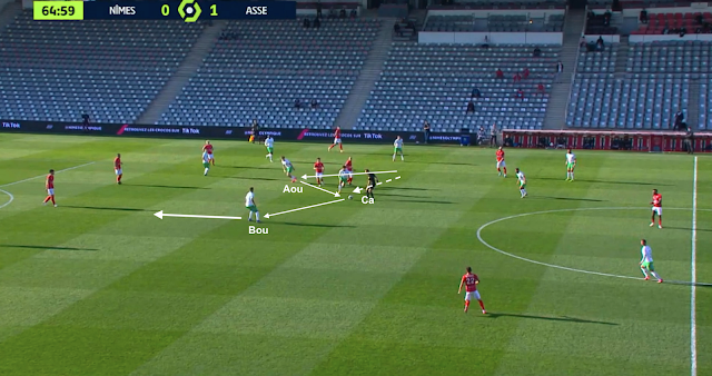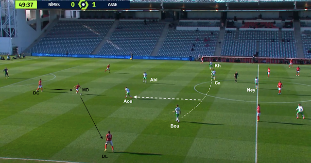 Un autre exemple du pressing stéphanois est visible après la pause, à la 50e minute, avec Aouchiche qui sort de la ligne pour attaquer la sentinelle nîmoise :