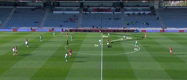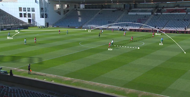 Sous son pressing, le central adverse n'a d'autre choix que de jouer en arrière avec son gardien. L'effort de Camara a été accompagné par Abi (placé en avant-centre sur cette action) et Aouchiche...