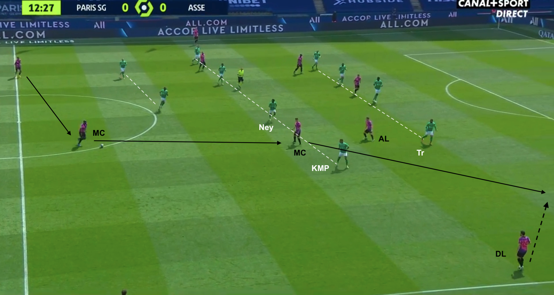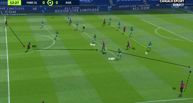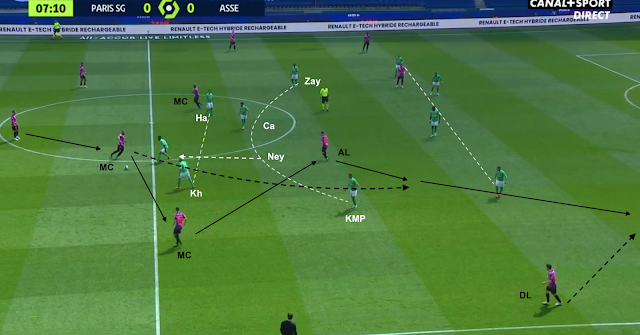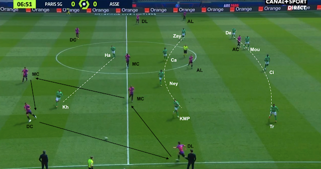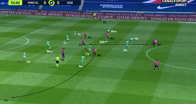 Le latéral droit est de nouveau lancé libre dans son couloir, son centre est de nouveau repoussé. Les attaques parisiennes ont continué et très souvent elles ont suivi le même schéma : amener le ballon l'axe dans le dos des milieux stéphanois avant de le donner dans un couloir (à droite pour un centre, à gauche pour un débordement).