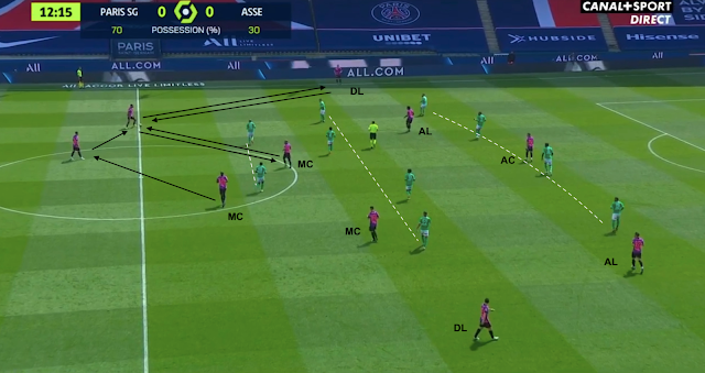 Les Verts sont en place, mais avec un positionnement assez axial des excentrés, KMP dans ce cas surveille un milieu axial parisien. Et comme l'ailier droit se place dans la même zone, le côté gauche du bloc stéphanois est concentré à un endroit, laissant libre le couloir :