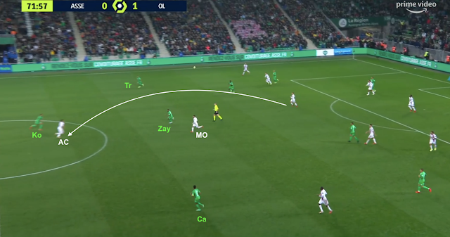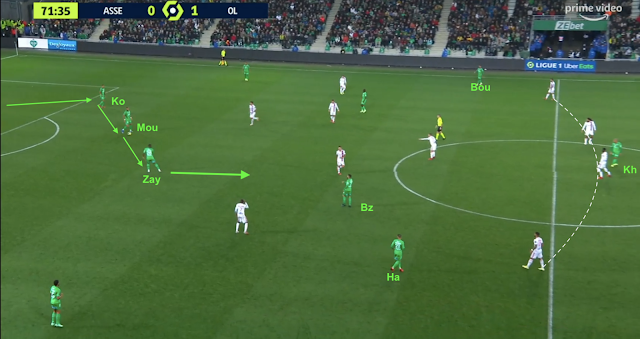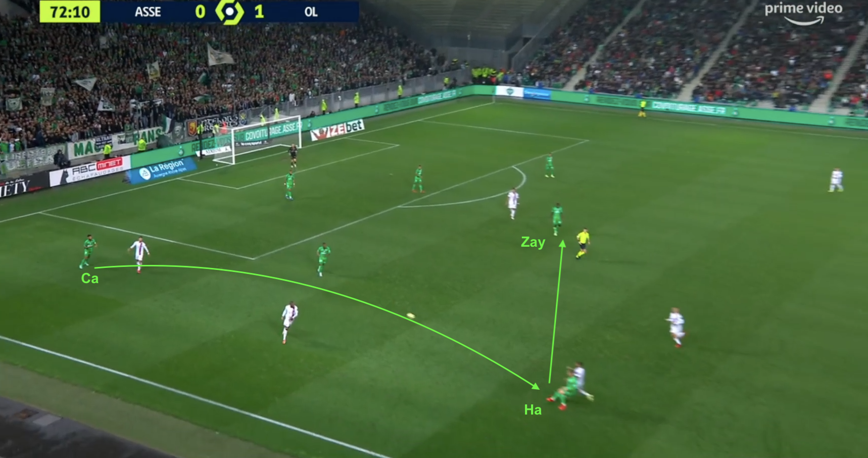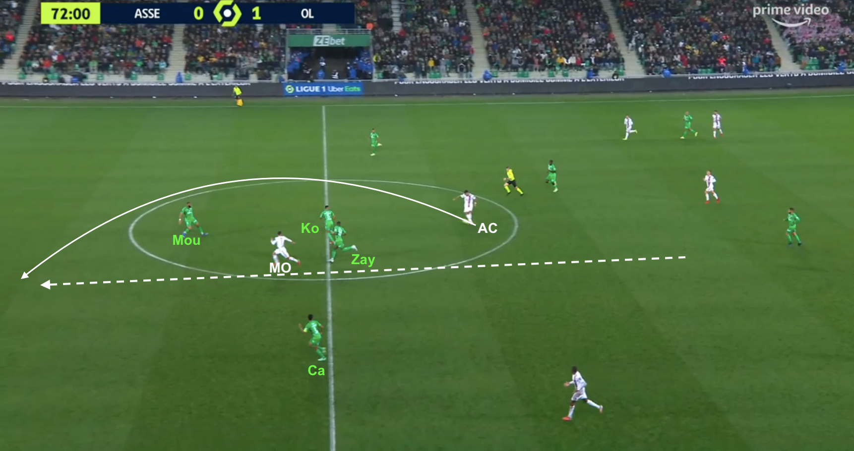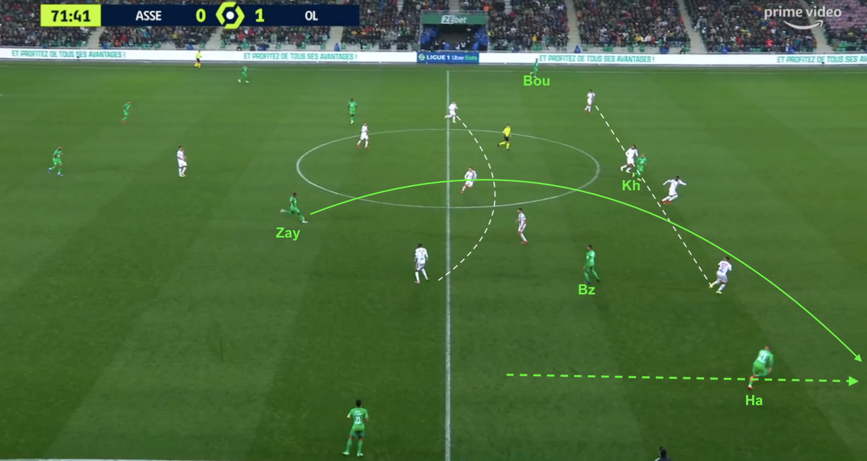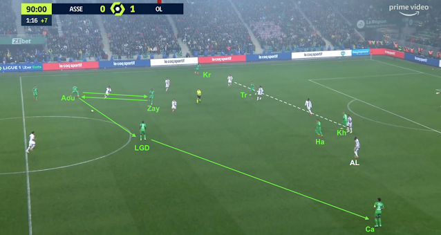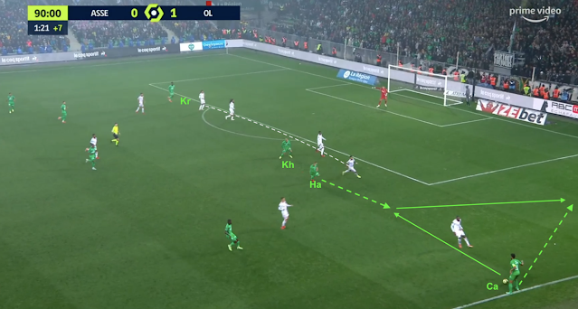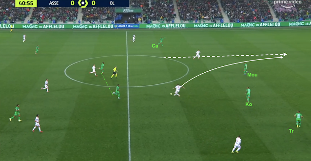 Les quatre offensifs stéphanois sont assez loin les uns des autres, mais le meneur de jeu temporise, avant de chercher avec un centre...