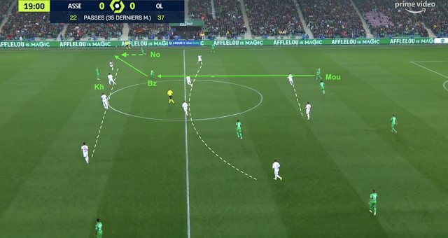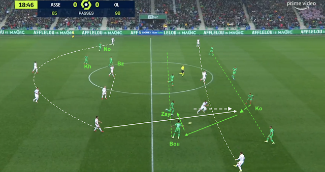 Les Lyonnais se remettent en place, tout comme les quatre offensifs stéphanois. Camara joue avec Youssouf et la remise du milieu axial pour son latéral est très bonne :