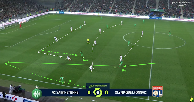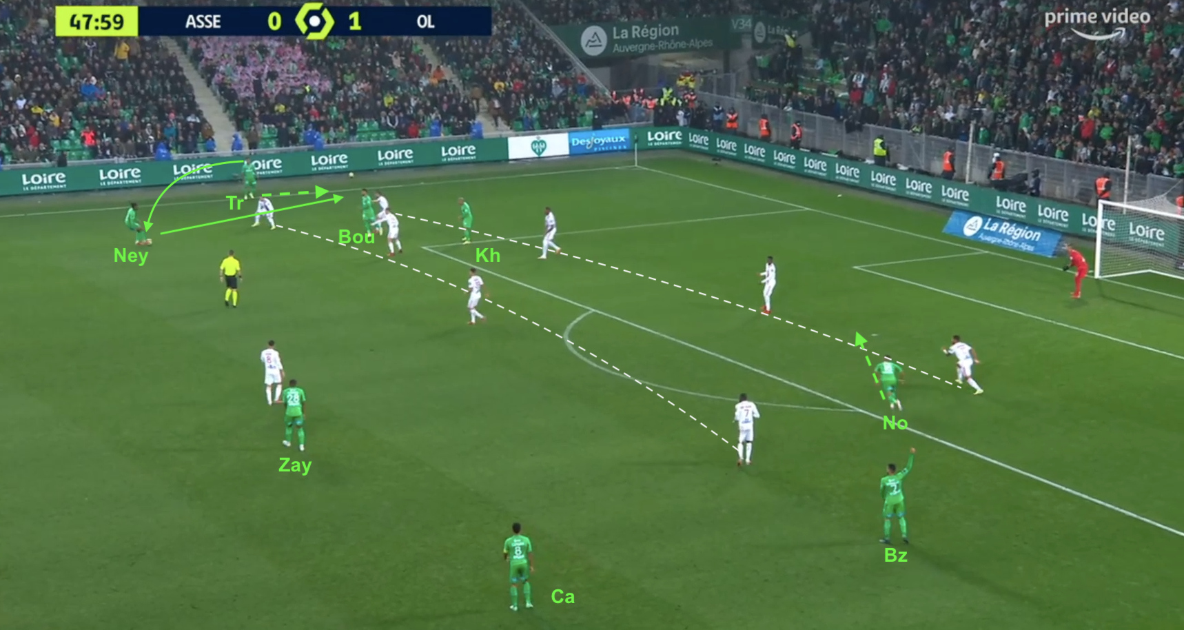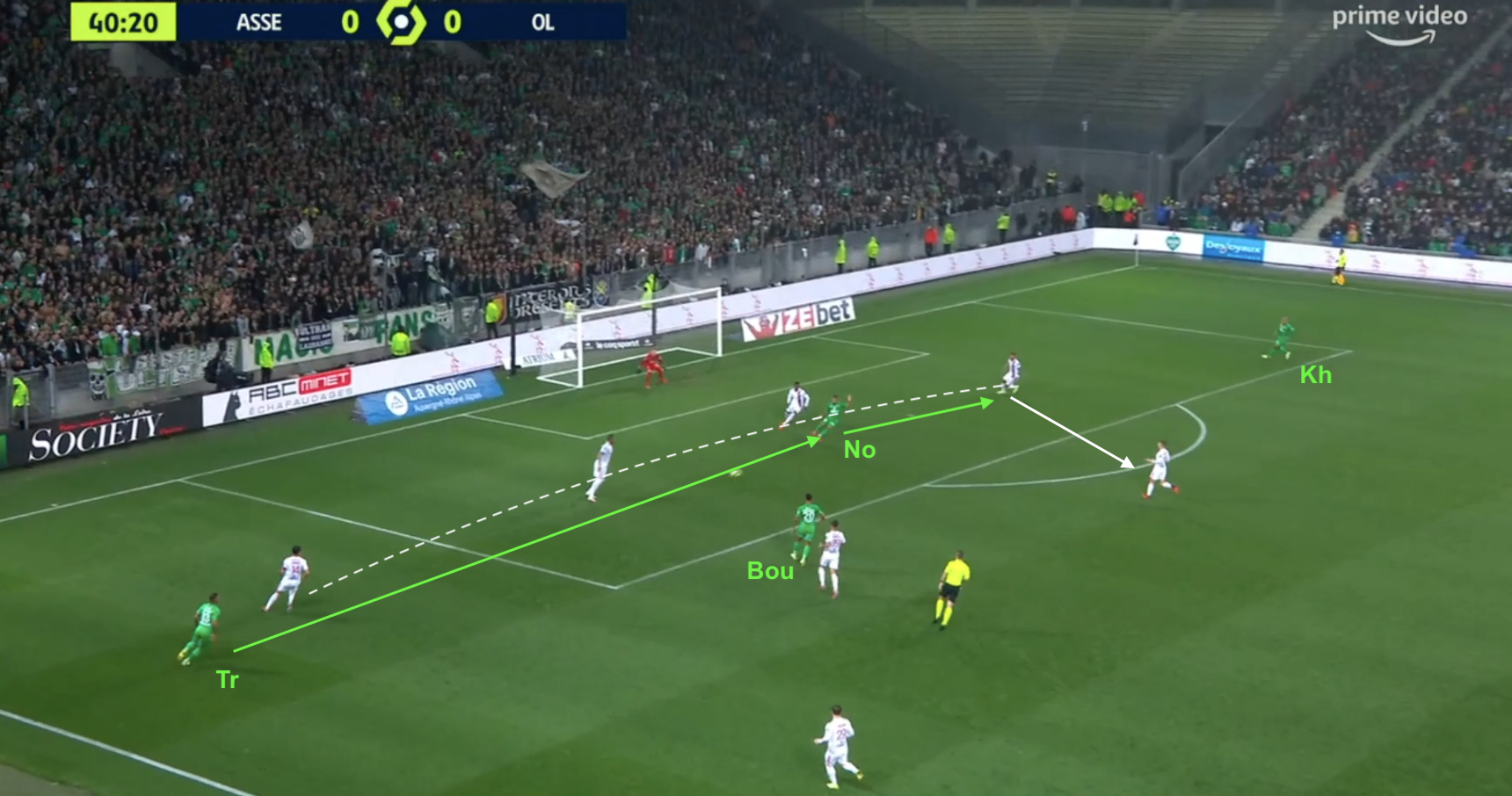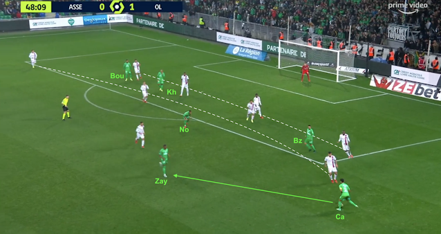 Passe verticale de Moukoudi, qui casse les lignes et trouve Boudebouz. Qui lance immédiatement Nordin à droite. Du jeu simple, vertical, pour lancer un ailier dans son couloir. Le Stéphanois progresse balle au pied...