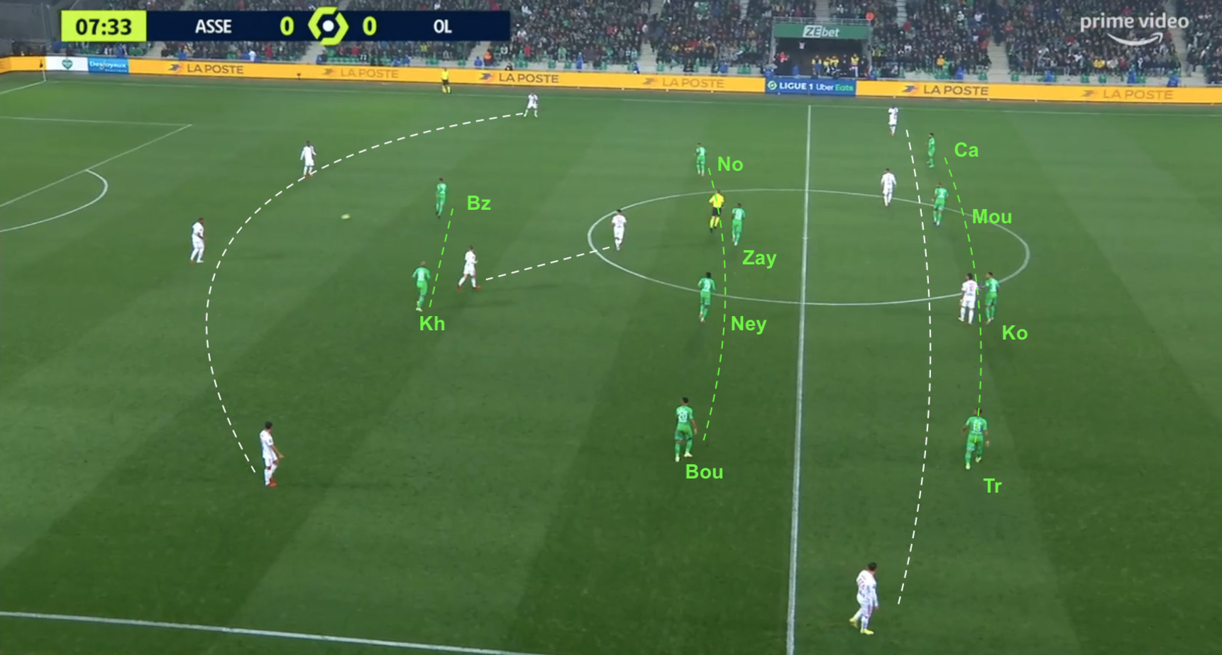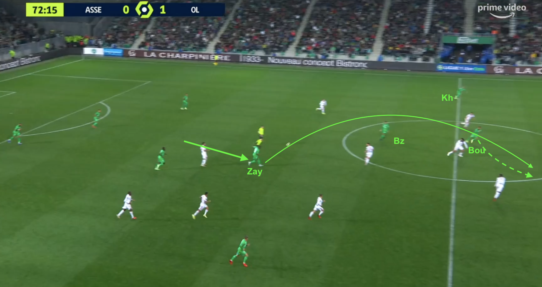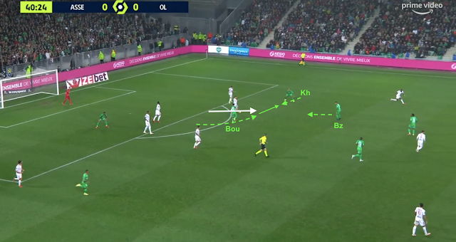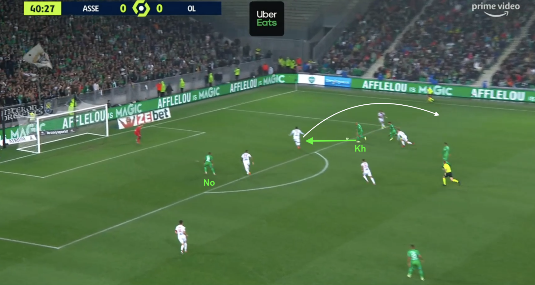 Passe verticale de Moukoudi, qui casse les lignes et trouve Boudebouz. Qui lance immédiatement Nordin à droite. Du jeu simple, vertical, pour lancer un ailier dans son couloir. Le Stéphanois progresse balle au pied...