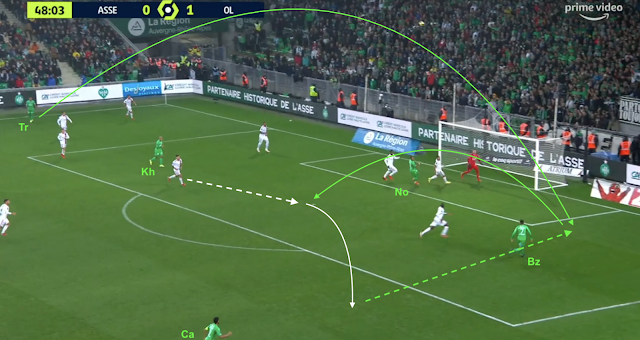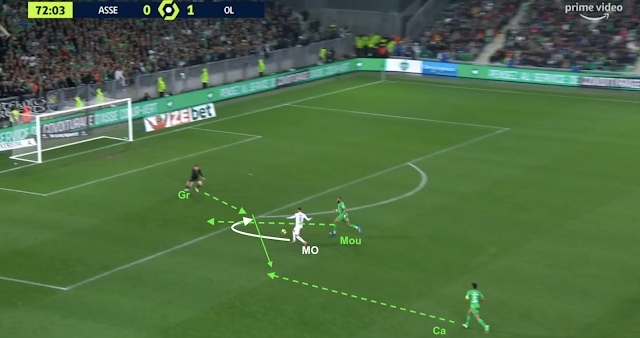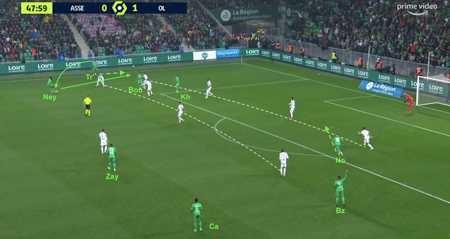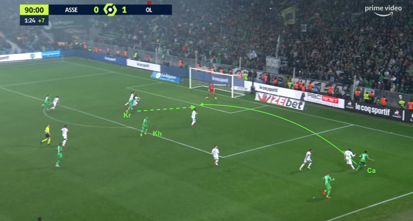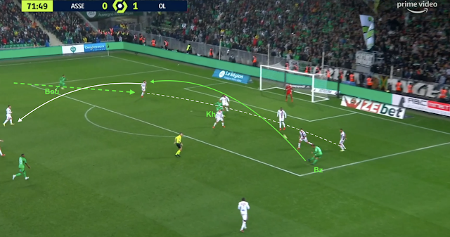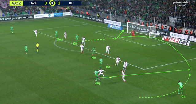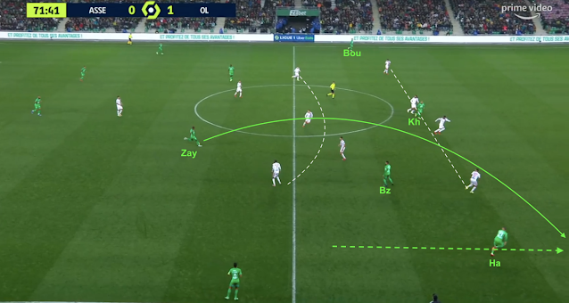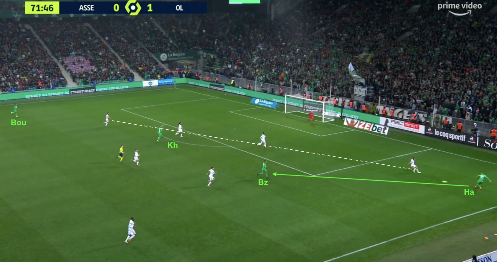 ...et lance encore une fois un coéquipier en profondeur, avec une passe au dessus de la défense. Cette fois-ci c'est Bouanga, qui se présente devant le vilain gardien, qui arrête le ballon de la main en dehors de la surface, se tenant ensuite le visage. Les Verts finissent ainsi le match en supériorité numérique, mais toujours derrière au score.