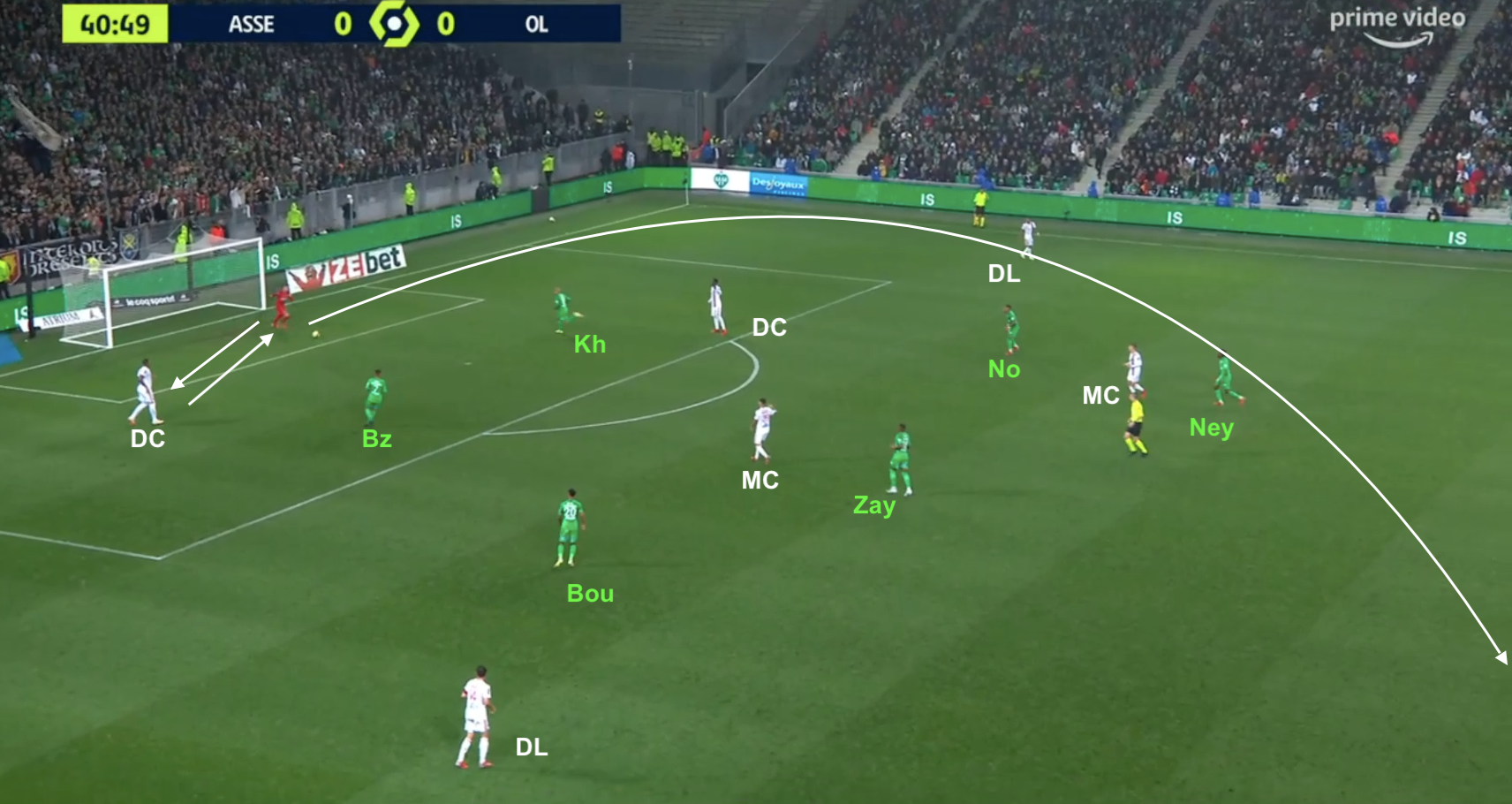 Un autre exemple, après la pause, commence avec une touche jouée par Trauco avec Neyou, pendant que le bloc adverse et les offensifs stéphanois sont tous autour de la ligne de 16 mètres :