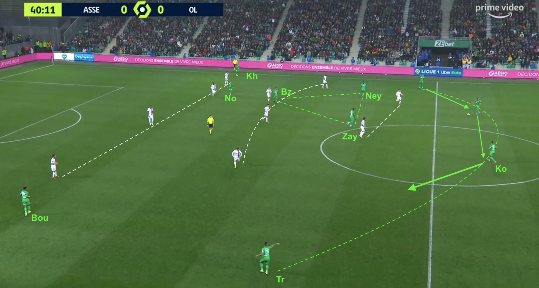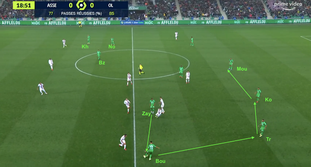 Après 40 minutes de jeu, les Stéphanois construisent une attaque en faisant circuler le ballon dans la défense, sur la ligne médiane :