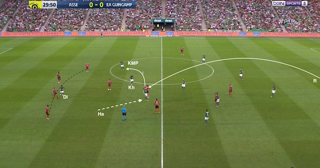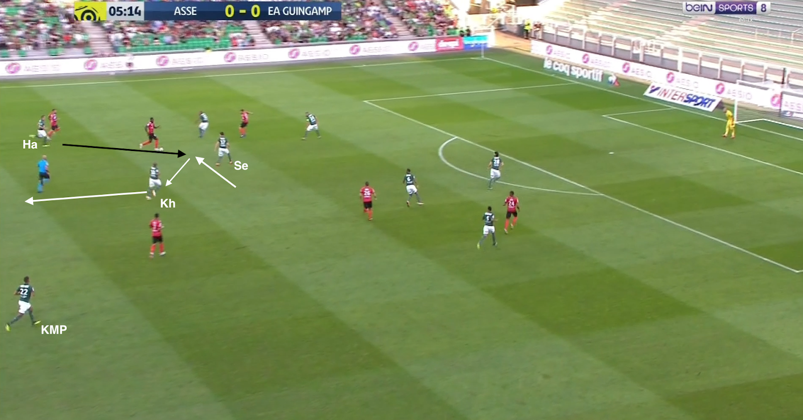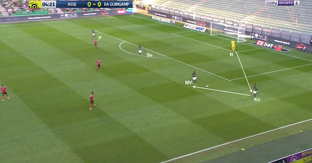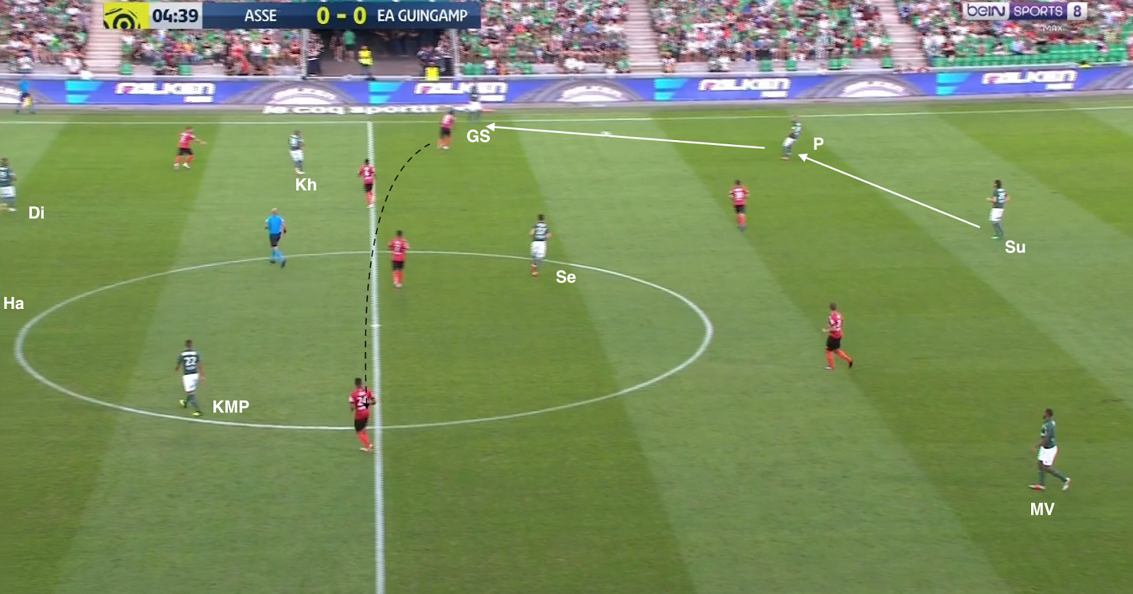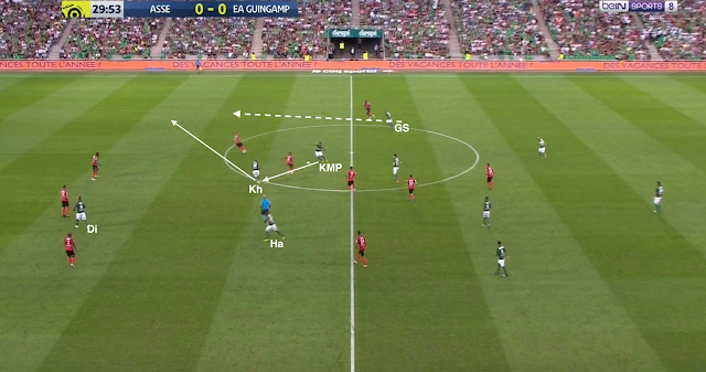 Sur cette image on peut aussi observer le triangle pointe haute de Guingamp, complètement pris dans le bloc stéphanois. L'entrée de Diousse pour Selnaes n'a rien changé au dispositif tactique, mais celle du jeune Camara pour KMP si :