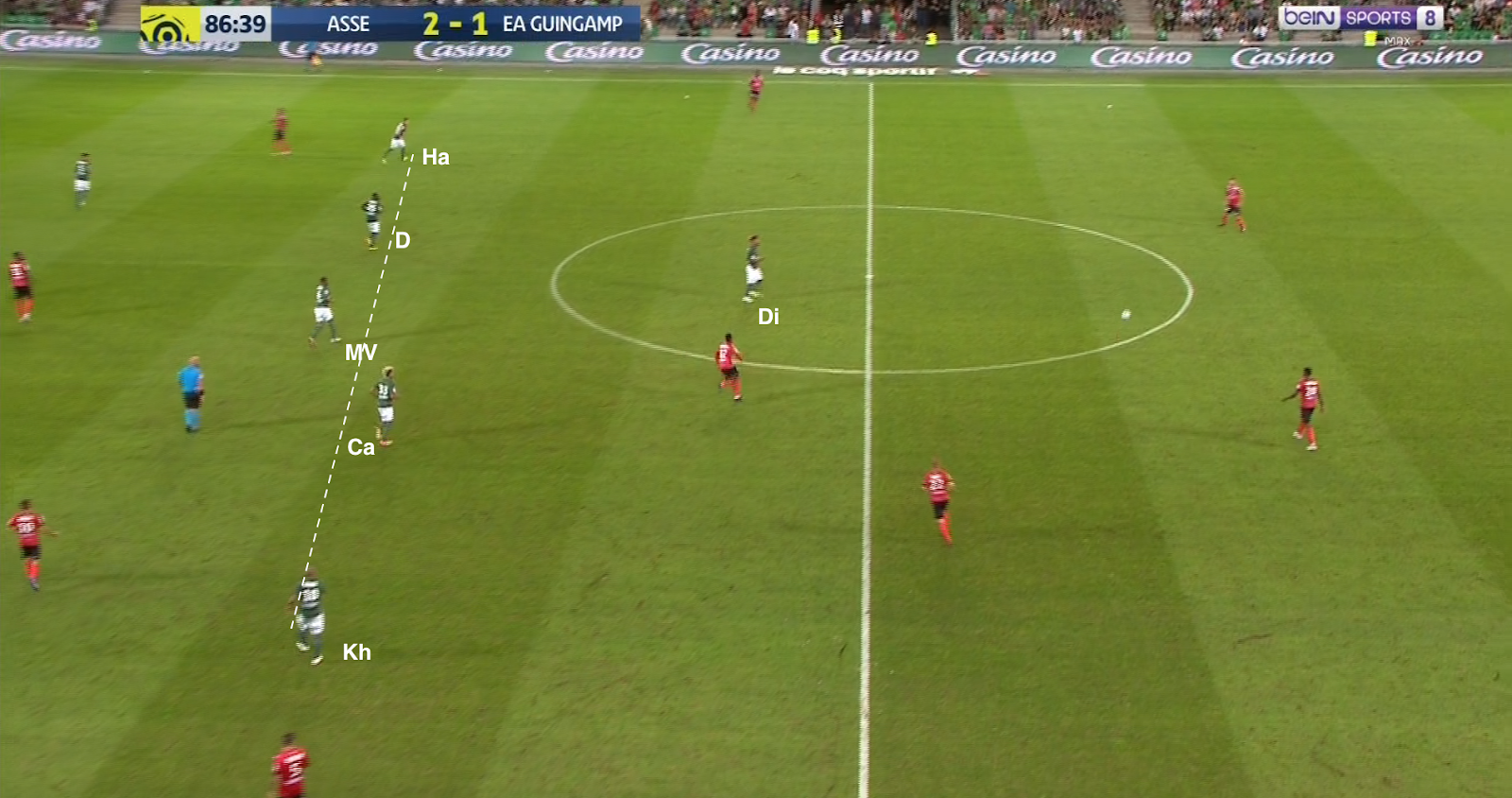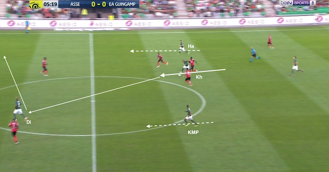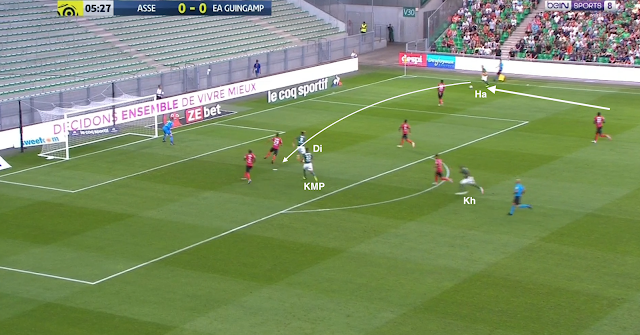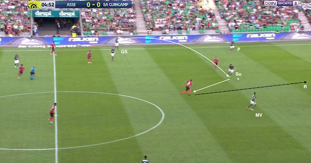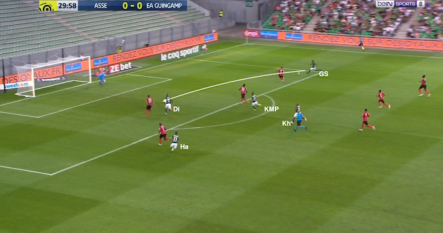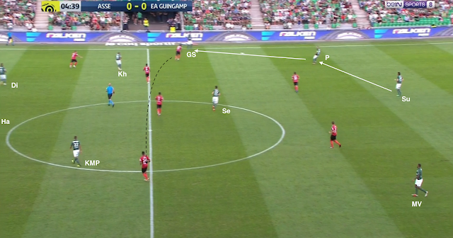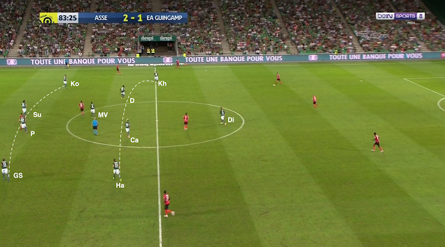Comme un clin d'oeil, c'est seulement à la 42e minute du match qu'on a vu une action qui ressemblait un peu à celles développées par l'ASSE lors de la dernière réception de Guingamp. Une relance propre, avec une longue phase de préparation au centre du terrain - au moins 10 passes, du dezonage, et quand le déséquilibre dans le bloc adverse est trouvé, l'attaque est lancée. Même si cette attaque à la 42e minute a été la seule du genre dans ce match, elle ne sera pas décrite dans cet article. C'était l'exception, pas la règle, qui a surtout consisté dans des attaques avec moins de préparation et souvent suite à des pertes de balle adverses, comme le montrent les exemples ci-dessous. Ce manque de préparation des attaques stéphanoises a été un choix tactique, mais aussi, surtout en 2MT, une conséquence des pertes de balle. Dieu le confirme "... la deuxième mi-temps a été très compliquée, on a laissé le ballon à Guingamp (...) On a reculé, ce n’était pas forcément voulu, en faisant trop d’erreurs". Et les stats reflètent parfaitement le manque de maîtrise des Verts, avec une possession de seulement 42% lors de chaque période et un pourcentage de passe réussies bien en dessous de ce qu'on était habitué, 78% en 1MT et seulement 74% en 2e.