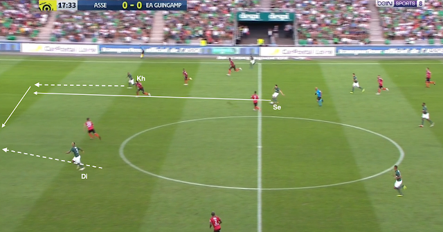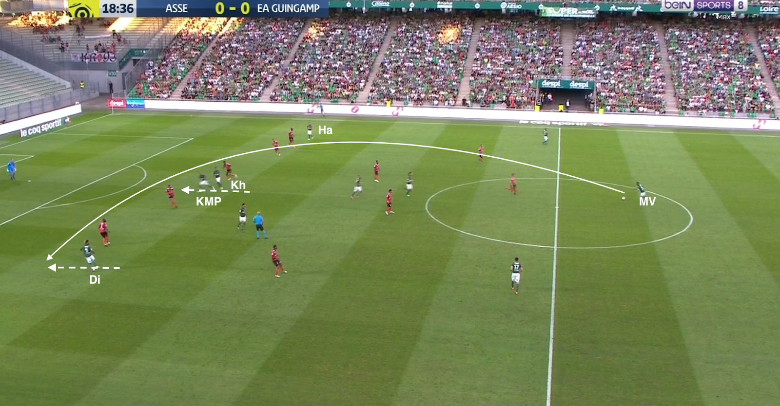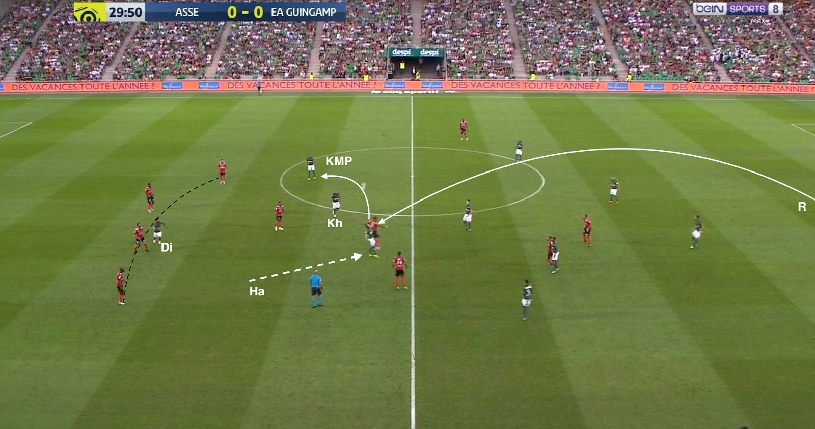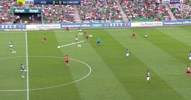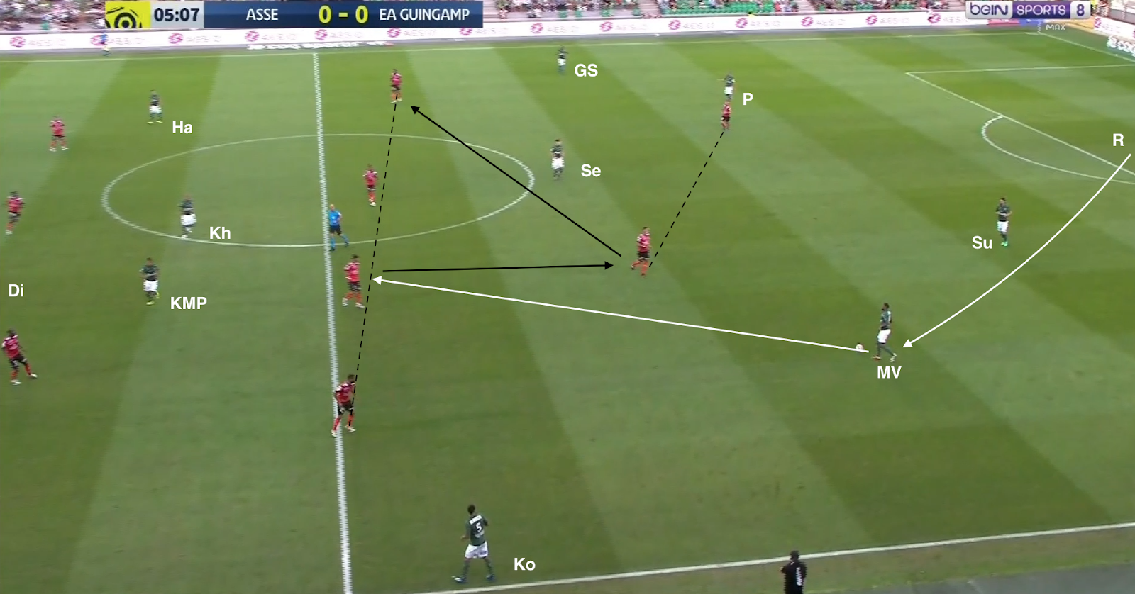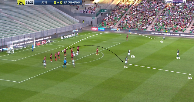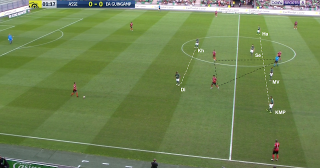 Le positionnement des Verts est le même qu'avant, la ligne de 4 milieux bretons coupe l'équipe en deux. M'Vila essaye quand-même de la traverser avec une passe, mais elle est interceptée et cette récupération haute peut être dangereuse :