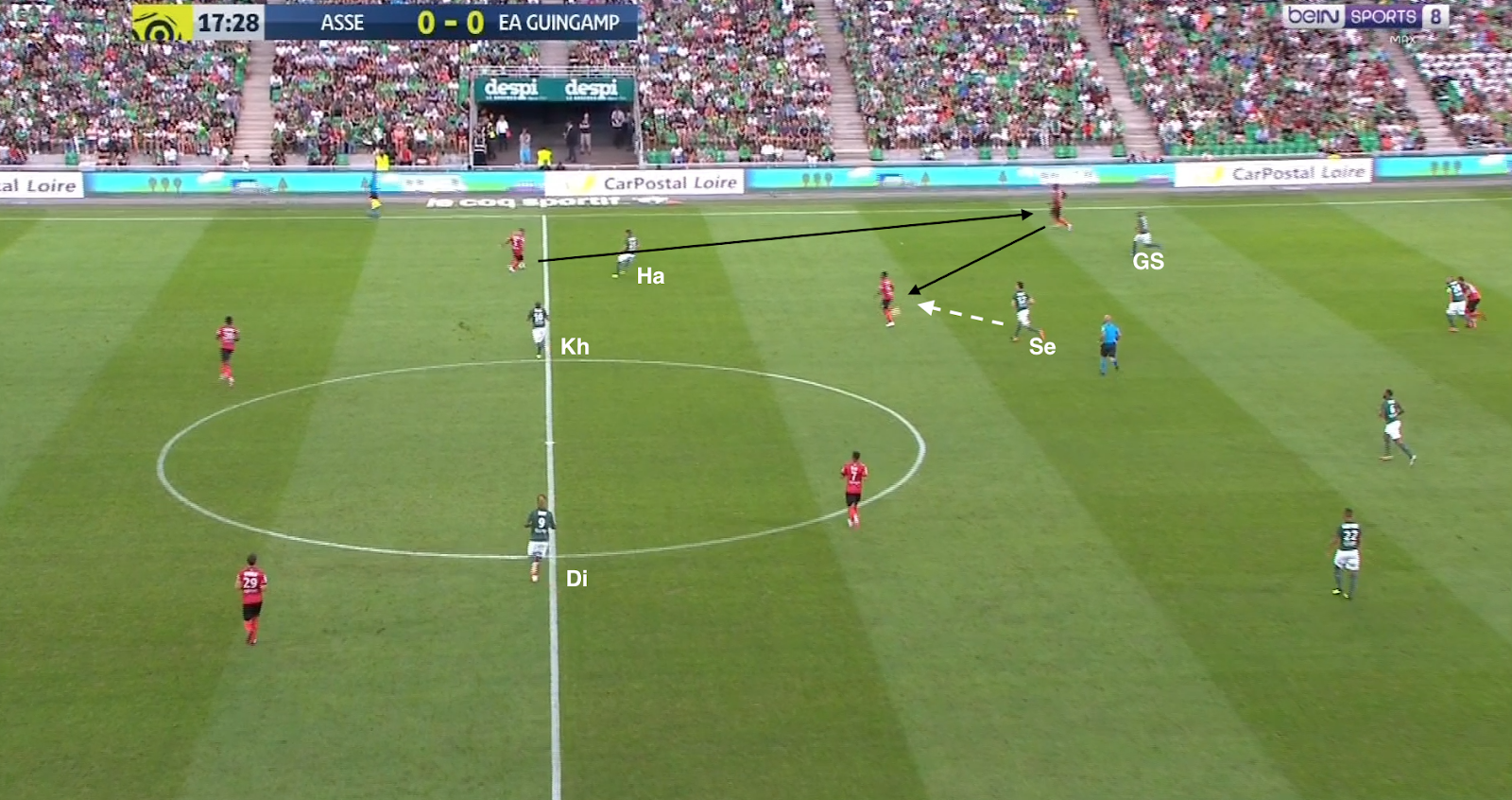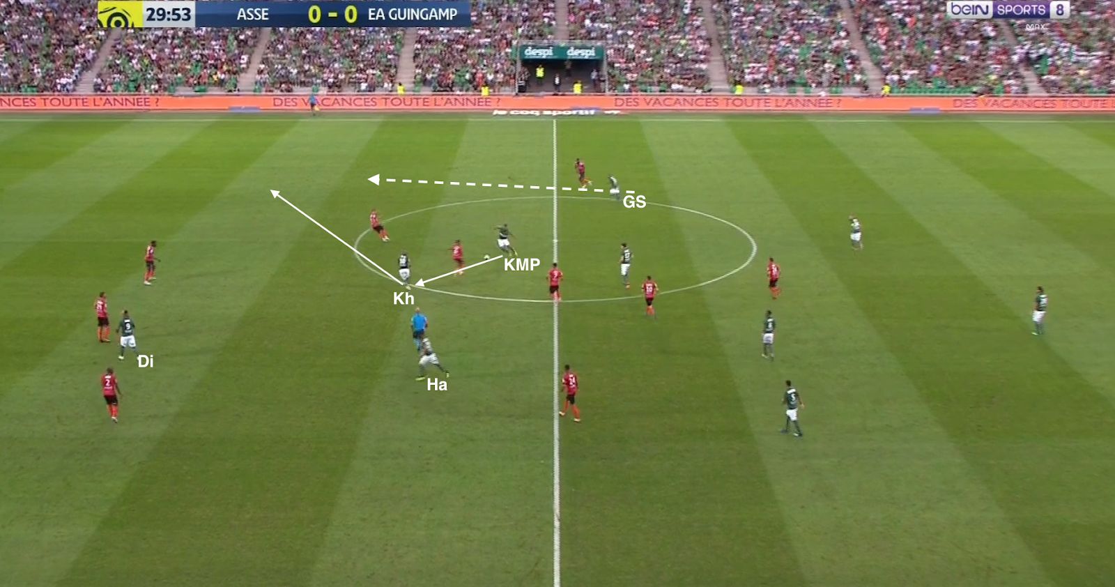Guingamp défend dans un bloc 4-4-2 et la ligne de 4 milieux sépare clairement les Stéphanois en 2, ceux qui sont censés construire et les quatre offensifs (Khazri, KMP, Hamouma et Diony) qui attendent que l'attaque soit amorcée. Mais il n'y a personne pour faire le lien, même si Selnaes propose une solution entre les lignes. Le ballon circule vers la droite...