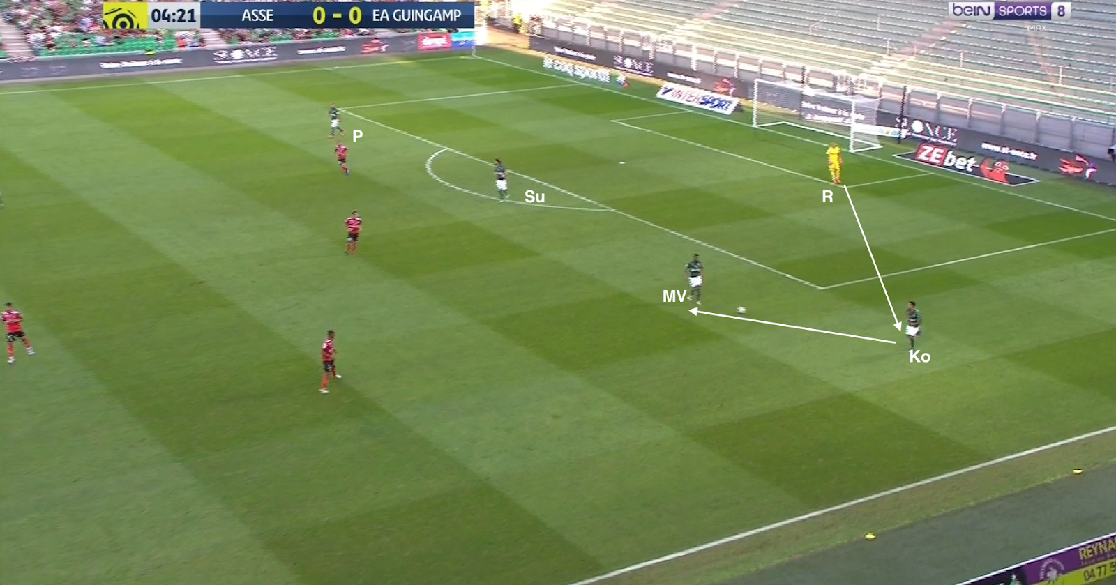 Une relance stéphanoise part de Ruffier, qui joue avec Kolo à gauche, qui donne le ballon à M'Vila. Il échange plusieurs passes avec Subotic pour donner le temps à leurs coéquipiers de se mettre en place et proposer des solutions :