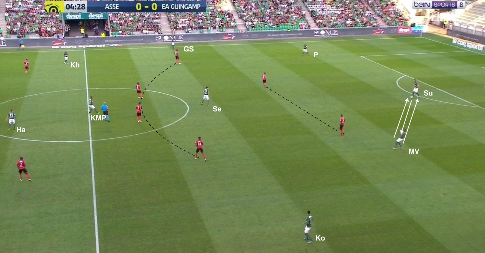 Le positionnement des Verts est le même qu'avant, la ligne de 4 milieux bretons coupe l'équipe en deux. M'Vila essaye quand-même de la traverser avec une passe, mais elle est interceptée et cette récupération haute peut être dangereuse :