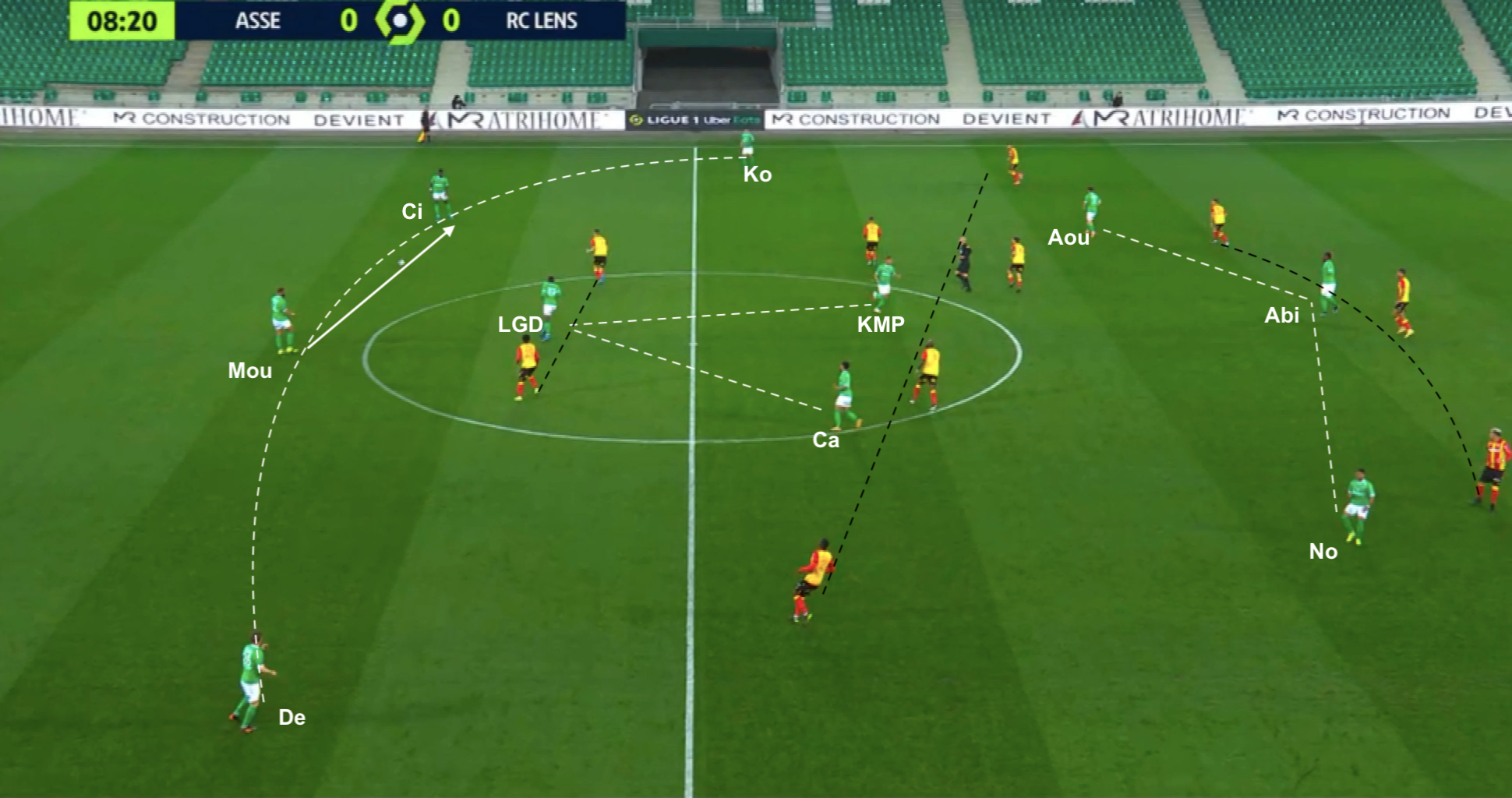 ... d'une passe verticale de Cissé à destination d'Aouchiche, qui dévie vers Abi. KMP s'était projeté entre les lignes et prend part à la combinaison avec son avant-centre. Un défenseur central était sorti sur Aouchiche, c'est du 3-contre-2 pour les stéphanois, aucun adversaire n'avait suivi KMP. Malheureusement, un défenseur s'interpose et le ballon est dégagé avant de finalement être mis en touche par un Lensois. Kolo joue la remise en jeu...