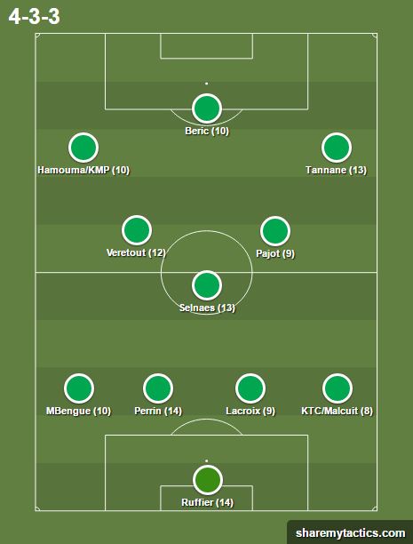 Avec plusieurs systèmes tactiques utilisés, il est presque impossible d'identifier une équipe-type - une fâcheuse habitude des Verts. Si on regarde seulement les 18 matchs joués en 4-3-3, la triplette titulaire au milieu le plus souvent ensemble est Selnaes, Veretout, Saivet (4 matchs démarrés ensemble dans ce système). La triplette offensive alignée le plus souvent ensemble est Tannane, Beric, KMP (4 matchs). Et les 6 joueurs alignés tous ensemble dans le onze de départ, c'est arrivé seulement deux fois, contre Monaco et à Gabala.