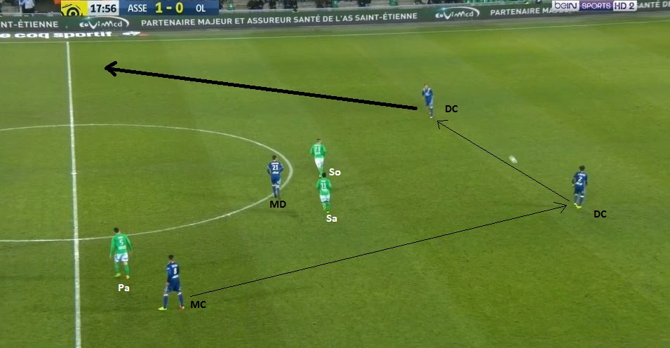 ... à destination du même ailier, toujours placé entre les lignes (nos deux lignes de 4 sont bien visibles). Cette fois-ci la pression défensive ne vient pas de Perrin, mais de Hamouma, qui arrive à lui prendre le ballon...