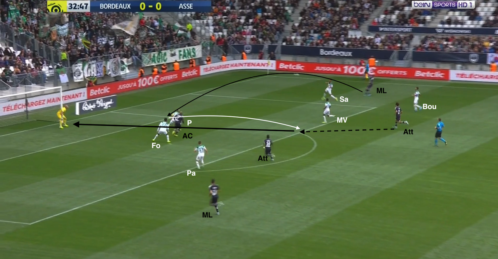 Dans cet exemple à la 37e, le gardien de Bordeaux joue un 6 mètres dans sa surface, avec un défenseur qui lui redonne le ballon. Les trois offensifs des Verts se trouvent dans la surface, les deux milieux sont très hauts aussi, pour serrer les milieux adverses... ce qui signifie qu'ils sont très loin des défenseurs. Et les mêmes deux attaquants s'y trouvent dans cet espace, où un d'entre eux est trouvé par la passe lobée du gardien. Bouanga trop haut, décalage fait vers le piston dans son couloir...