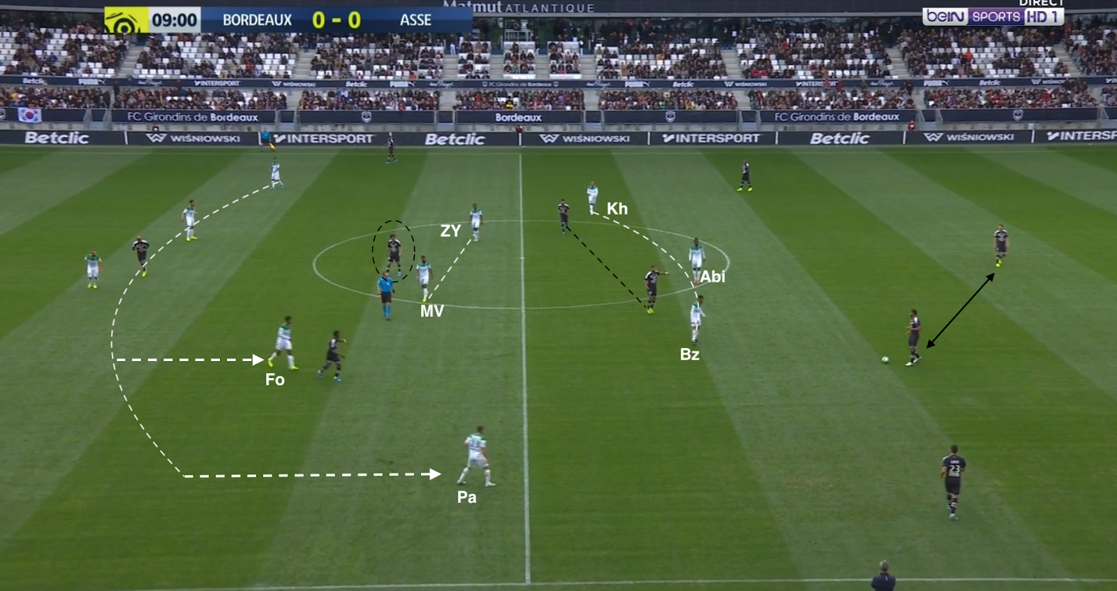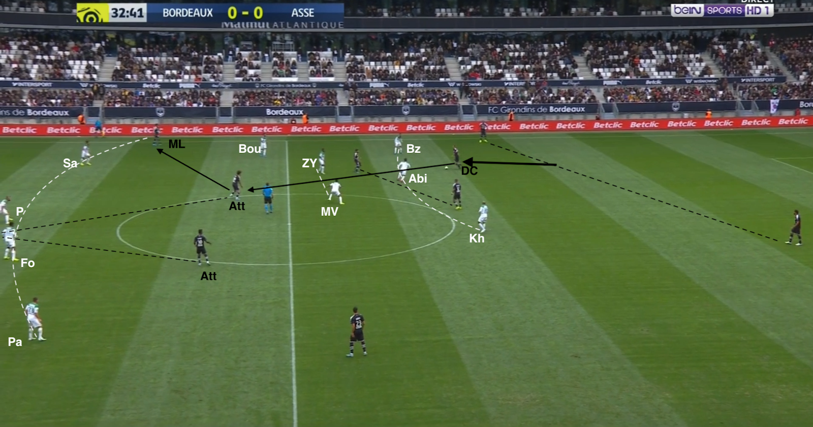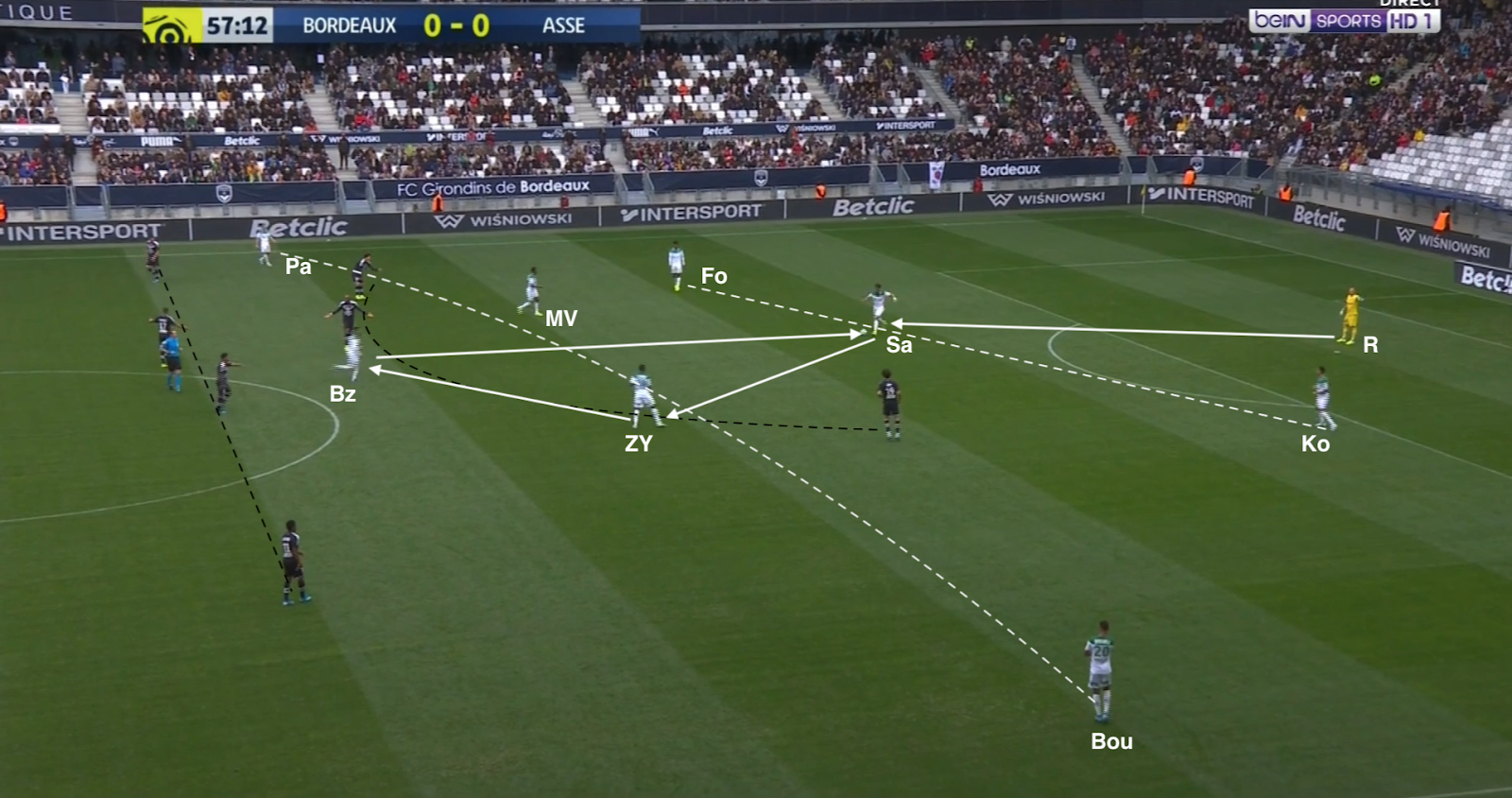 Ruffier relance avec Saliba, qui joue plus haut avec Youssouf : le (3-)4-3 des Girondins est visible, tout comme le 3-4-1-(2) des Verts, Boudebouz ayant décroché pour offrir une solution. Il est trouvé par Youssouf et joue en arrière avec Saliba, qui décale à gauche avec Kolo :
