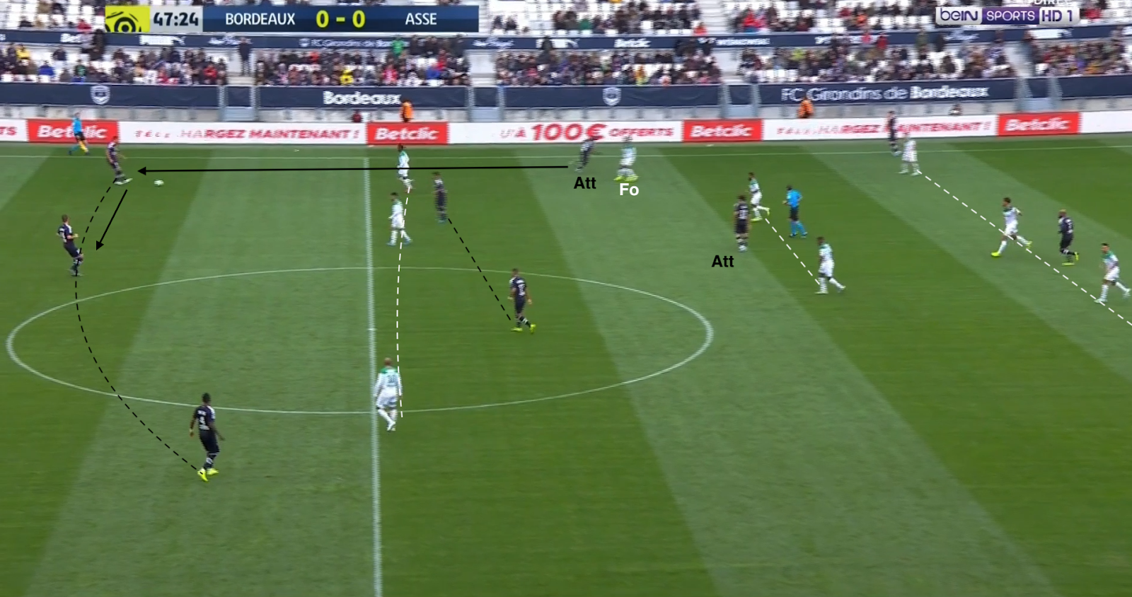Après les premières 10 minutes, plutôt équilibrées, les Bordelais ont mis le pied sur le ballon, avec 70% de possession jusqu'à la pause. Et même s'ils avaient une animation offensive capable de transformer cette possession en occasions, la défense stéphanoise a tenu bon, comme dans cet exemple à la 33e :