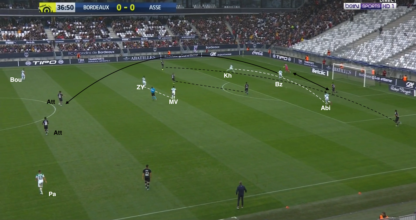 Un 5-2-3 avec Palencia et Bouanga en pistons, Perrin entouré de Saliba et Fofana en défense centrale, M'Vila et Youssouf au milieu et une ligne de trois offensifs Khazri-Abi-Boudebouz. Du côté de Bordeaux, un système similaire, 3-4-3 (ou 5-2-3) - sur cette image on voit un des trois offensifs décrocher au niveau des milieux. Et comme contre Lyon, les Stéphanois ont bien resserré les lignes des milieux et attaquants pour empêcher les adversaires de trouver leurs milieux. Leur défense centrale combine, essaie de déplacer le jeu vers la gauche...