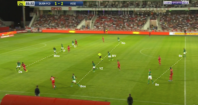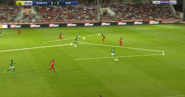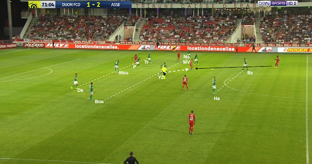 A l'heure de jeu le staff de l'ASSE a commencé à faire des changements. Khazri - son premier match après des courtes vacances - a laissé sa place à Youssouf Zaydou. Ce dernier à pris le couloir gauche, le poste d'avant-centre a été occupé parfois par Bouanga, parfois par Hamouma. Par le premier dans cet exemple qui commence à la 64e par un dégagement du gardien adverse...