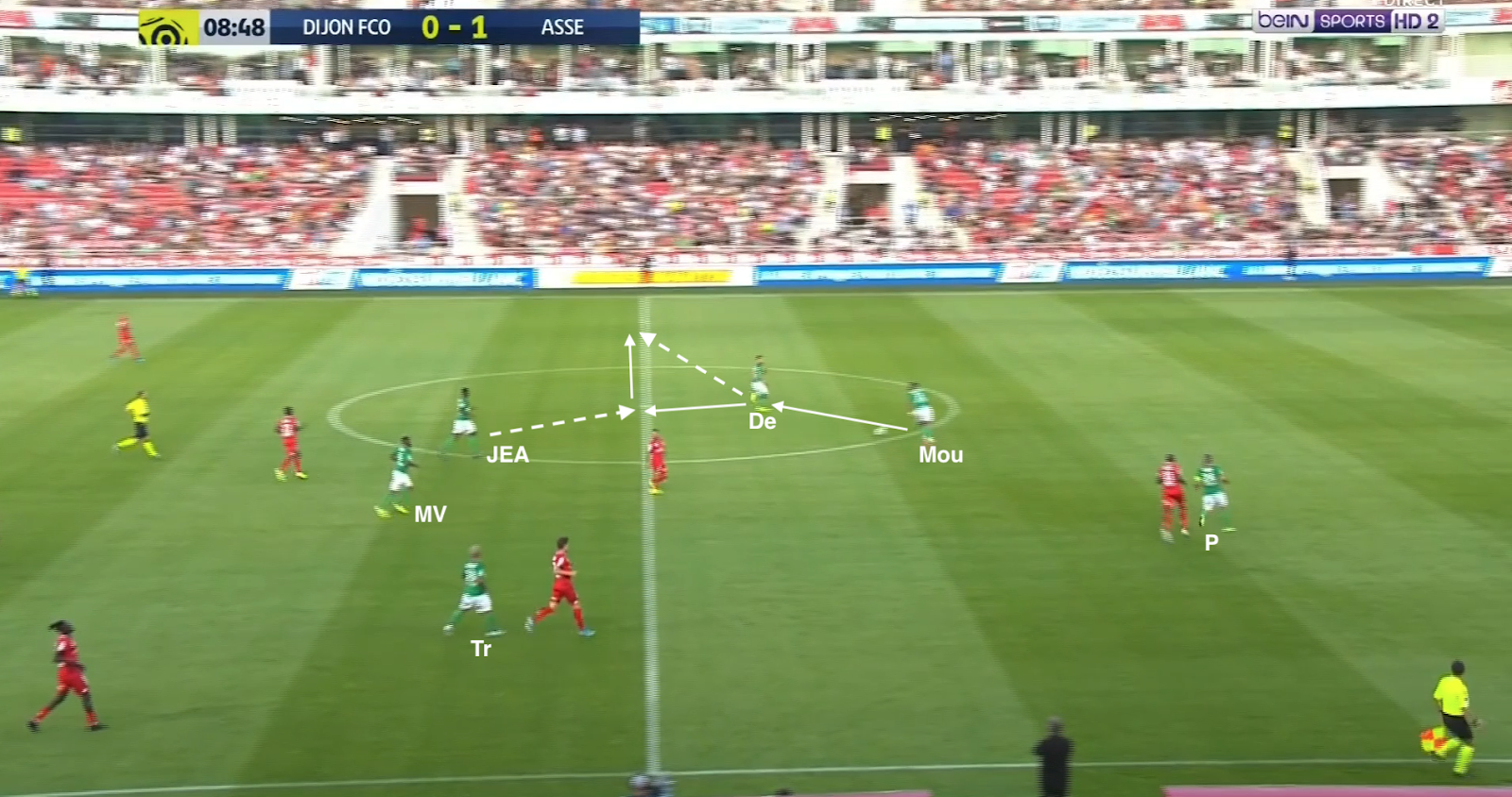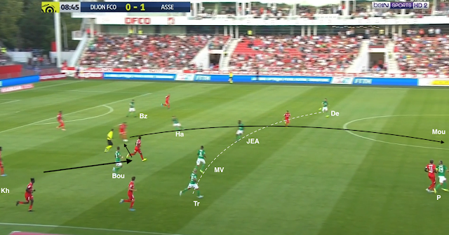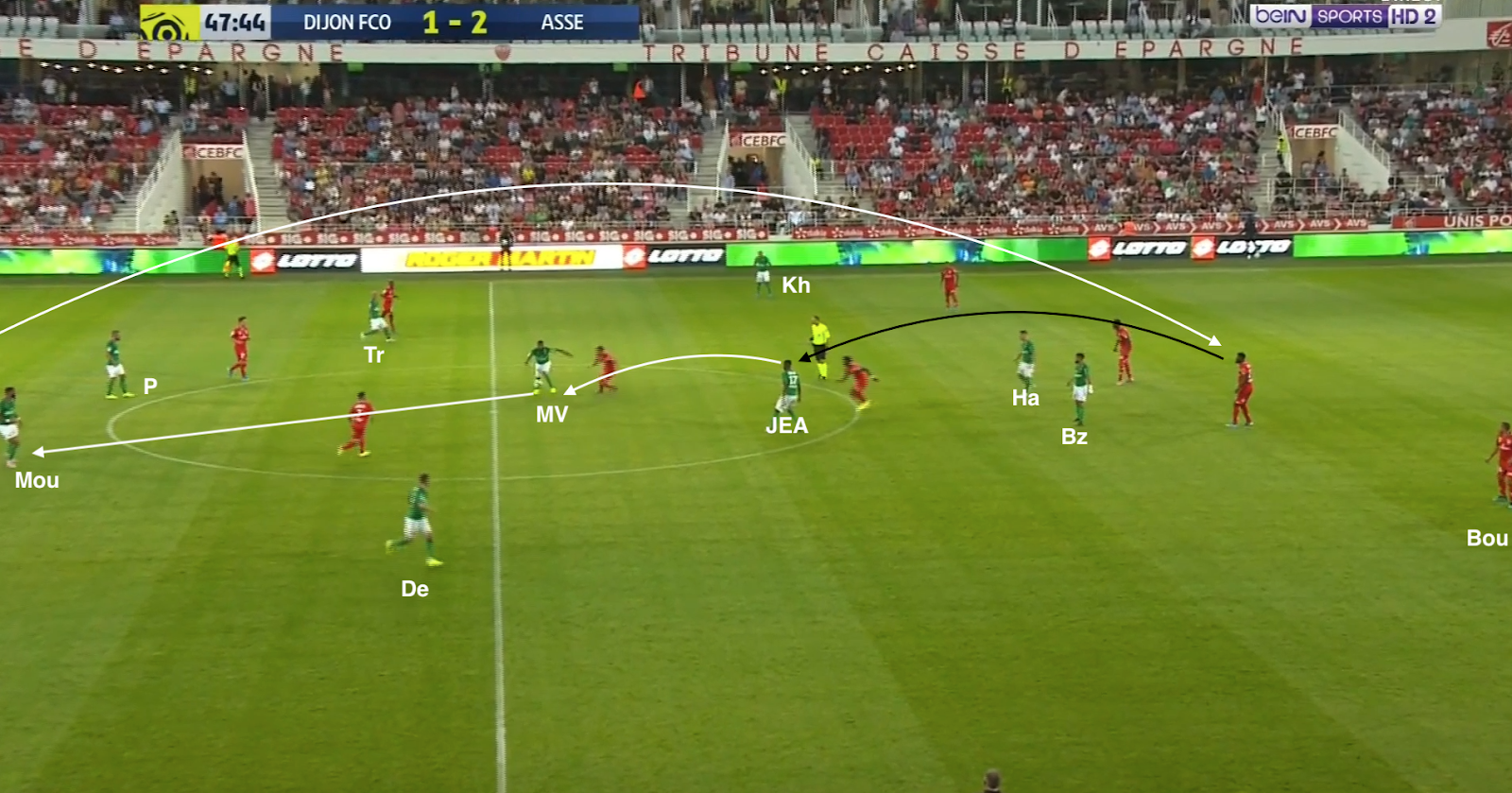 ... sauf que c'est Aholou qui repousse de la tête. Le 4-2-3-1 des Verts est visible et M'Vila récupère rapidement le ballon dans les pieds d'un milieu dijonnais. Récupération haute - projection immédiate vers l'avant :